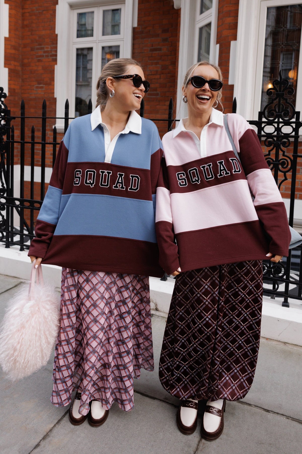 Polo-Bluse von Cras mit Farbblöcken in Hellblau und Bordeaux. Die Bluse hat einen SQUAD-Print auf der Brust und einen klassischen Polokragen.