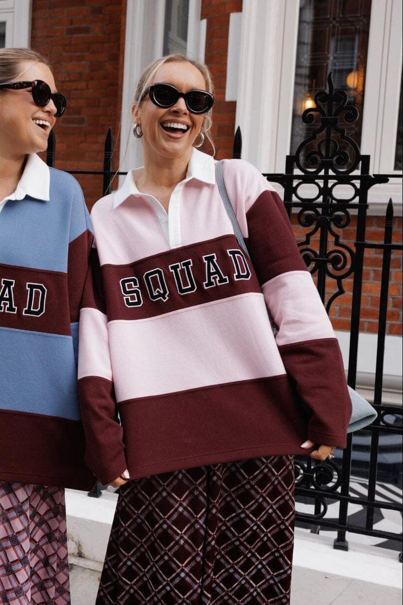 Polo-Bluse von Cras in Rosa mit pink- und dunkelbraunfarbenen Streifen. Die Bluse hat einen weißen Kragen und einen SQUAD-Print auf der Brust.