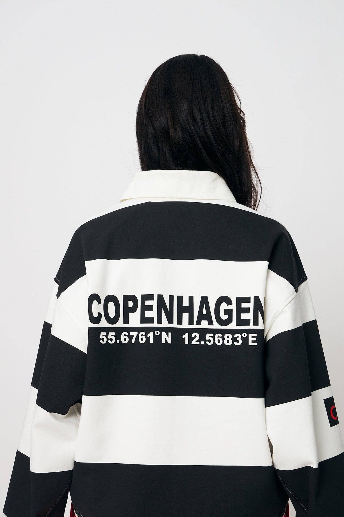 Schwarze und elfenbeinfarbene Bluse von Cras mit Streifen und grafischem Voilà-Print in Rot. Die Bluse hat eine oversized Passform mit Polokragen und langen Ärmeln.