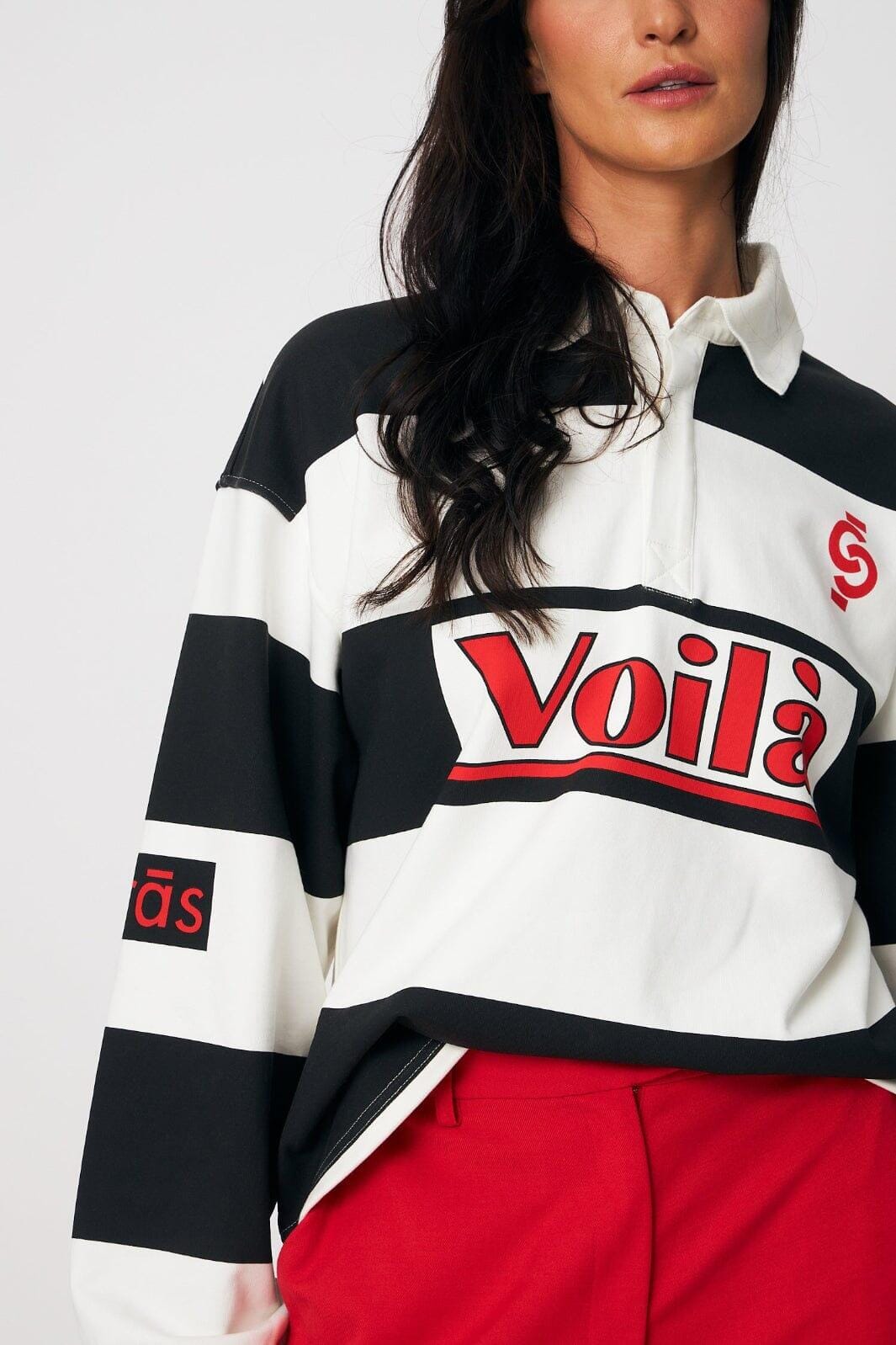 Schwarze und elfenbeinfarbene Bluse von Cras mit Streifen und grafischem Voilà-Print in Rot. Die Bluse hat eine oversized Passform mit Polokragen und langen Ärmeln.