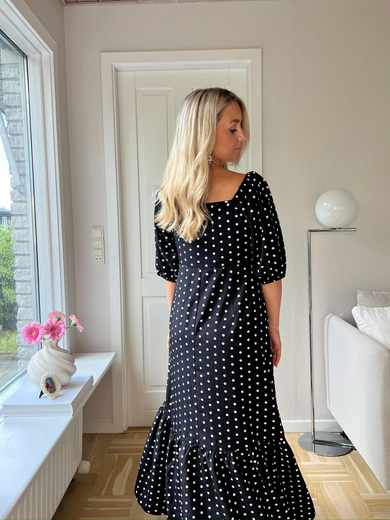 Schwarzes knöchellanges Kleid mit weißen Punkten. Der quadratische Ausschnitt und die 3/4-Ärmel verleihen dem Kleid einen klaren und einfachen Look. Der Rüschenrand am Saum sorgt für Bewegung in der lockeren Passform.
