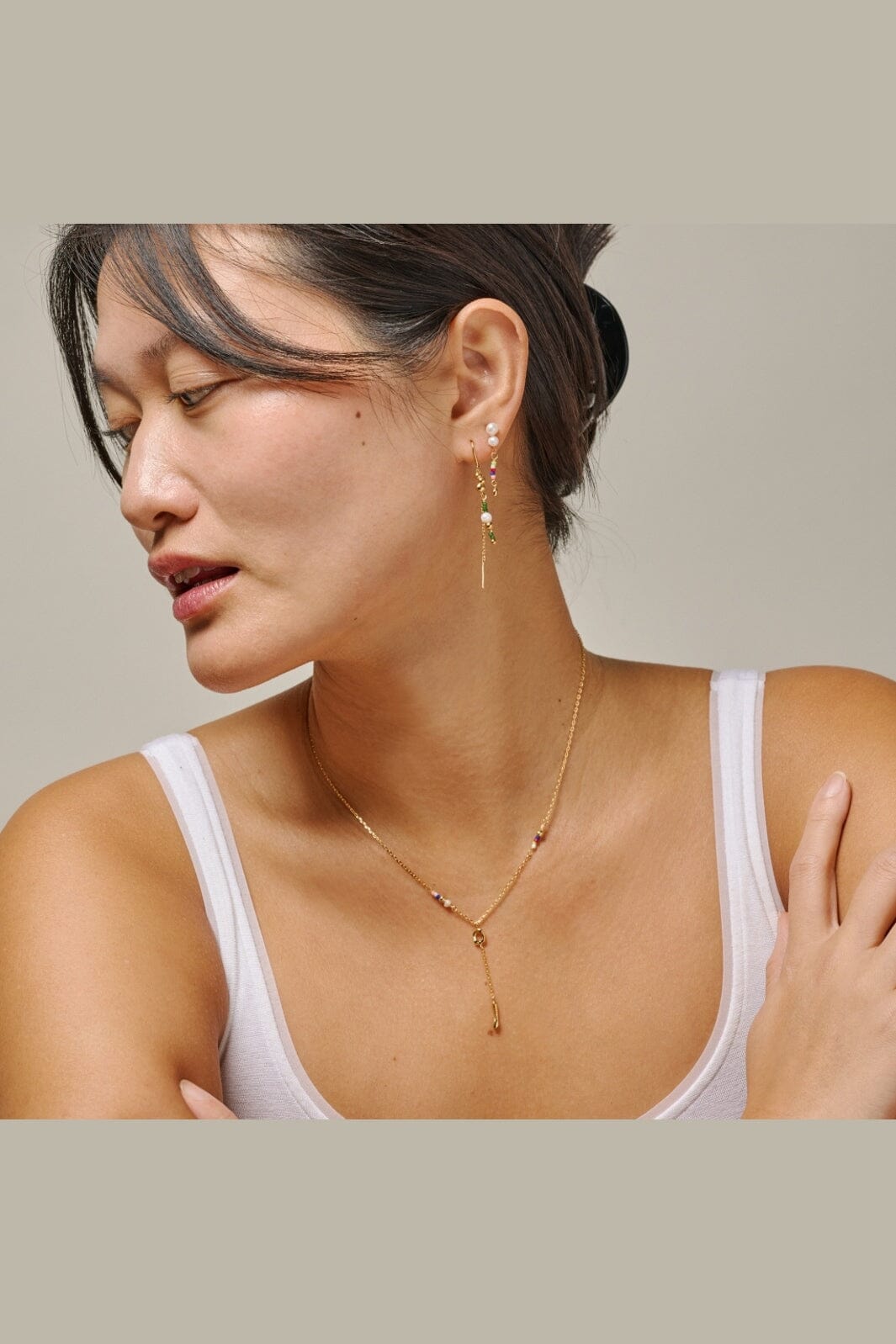 Ohrringe von Enamel Copenhagen, gefertigt aus 18K vergoldetem recyceltem Sterlingsilber. Die langen Ketten sind mit organischen Goldelementen, weißen Süßwasserperlen und grünen Miyuki-Perlen verziert.