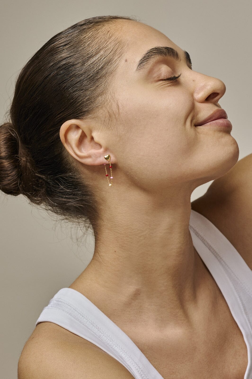 Ohrringe von Enamel Copenhagen mit herzförmigem Stecker aus vergoldetem Silber. Eine Kette mit roten, pinken und weißen Perlen hängt unter dem Herz.