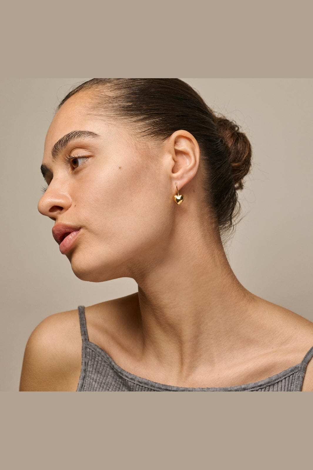 Vergoldete Ohrringe von Enamel Copenhagen mit herzförmigem Design. Die Ohrringe haben eine glänzende Oberfläche und gebogene Haken, die eine organische Silhouette verleihen.
