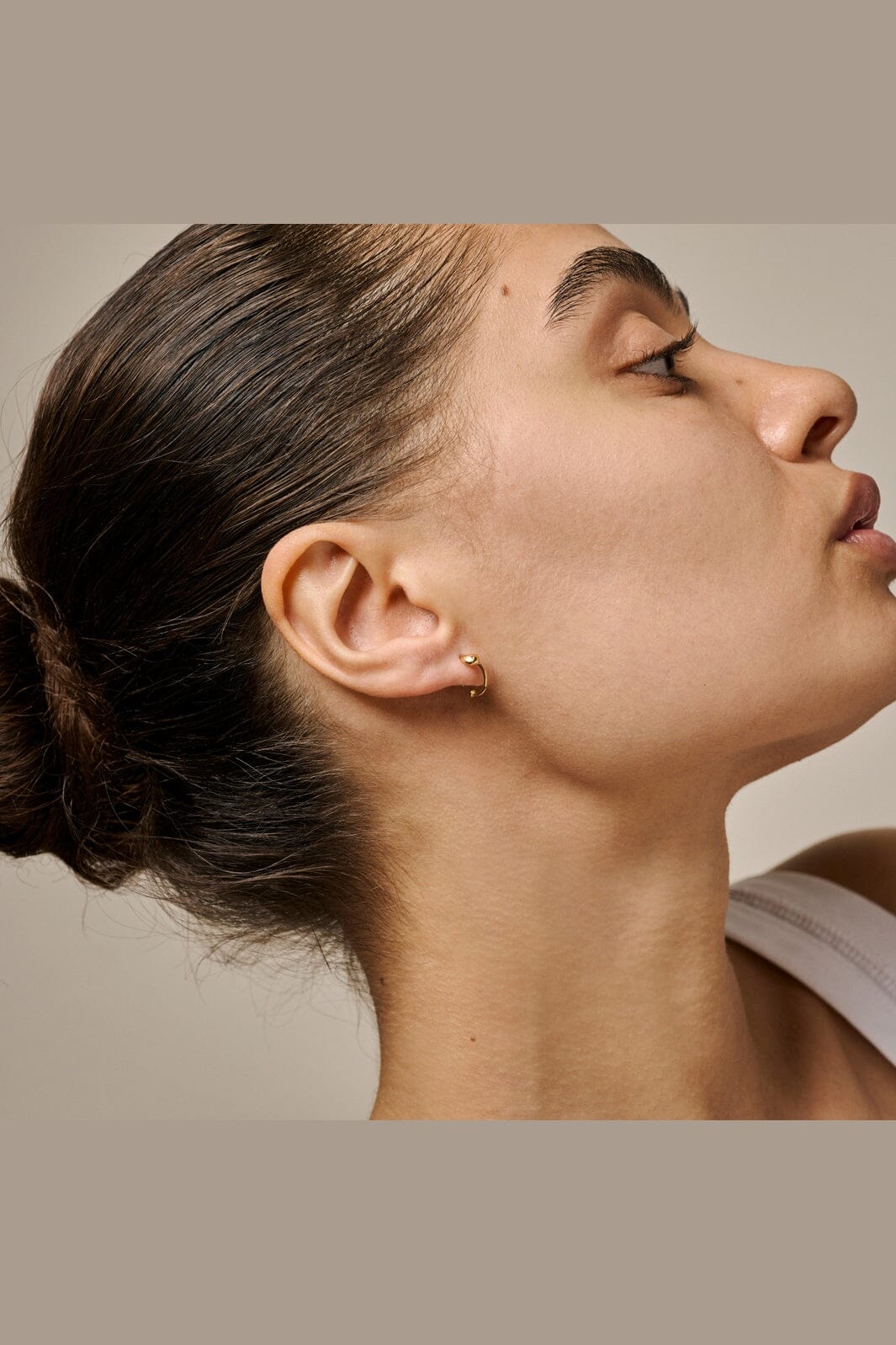 Kleine Creolen von Enamel Copenhagen mit einem gedrehten Tropfendesign. Die Ohrringe haben eine glänzende, vergoldete Oberfläche und ein organisches Detail vorne in Form eines Tropfens.