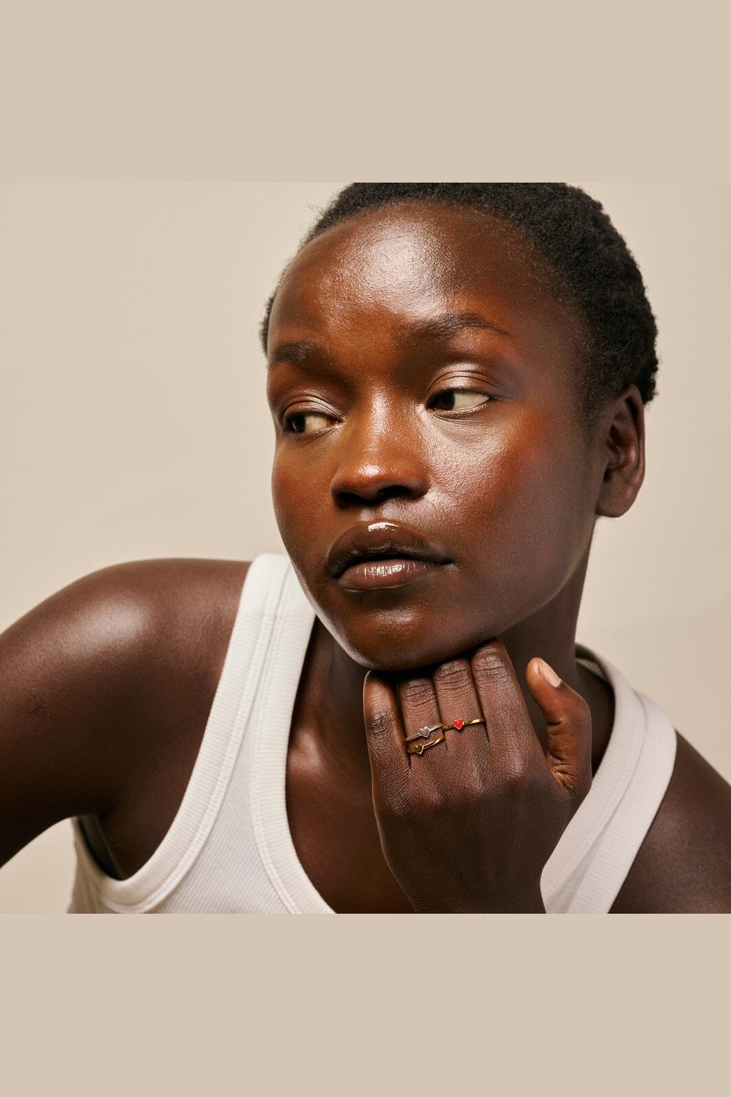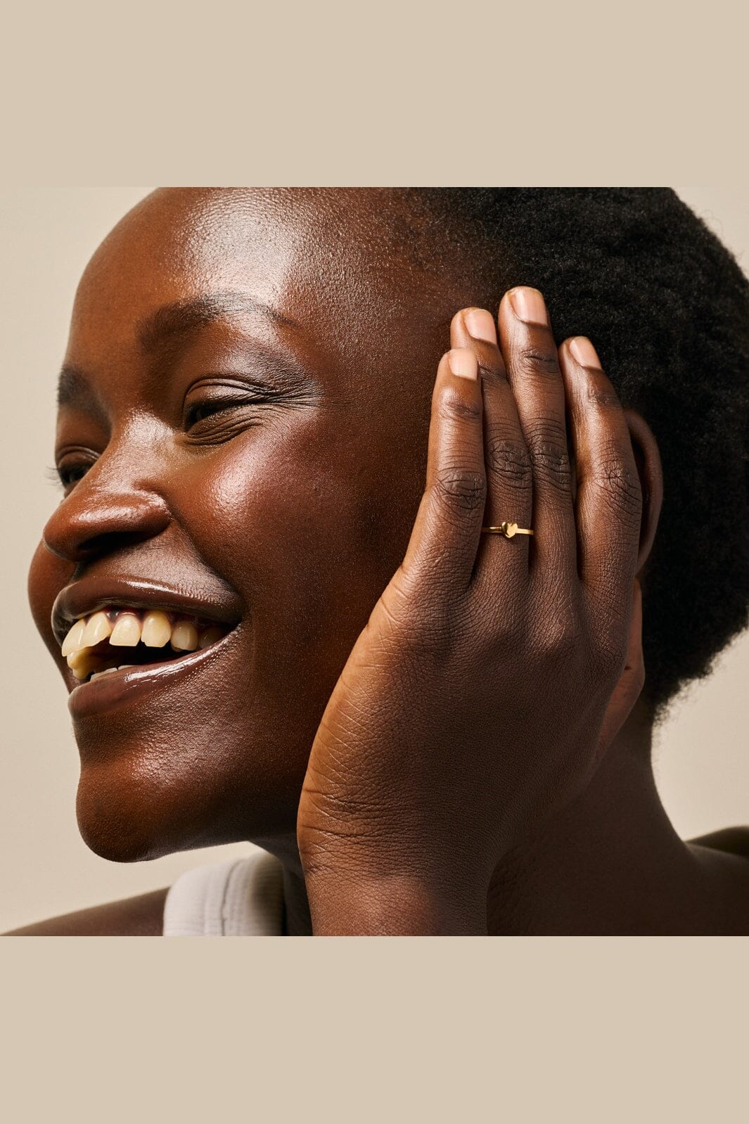 Goldfarbener Ring von Enamel Copenhagen mit offenem Design und einem kleinen Herz. Der Ring ist aus recyceltem Sterlingsilber mit 18K Vergoldung gefertigt.