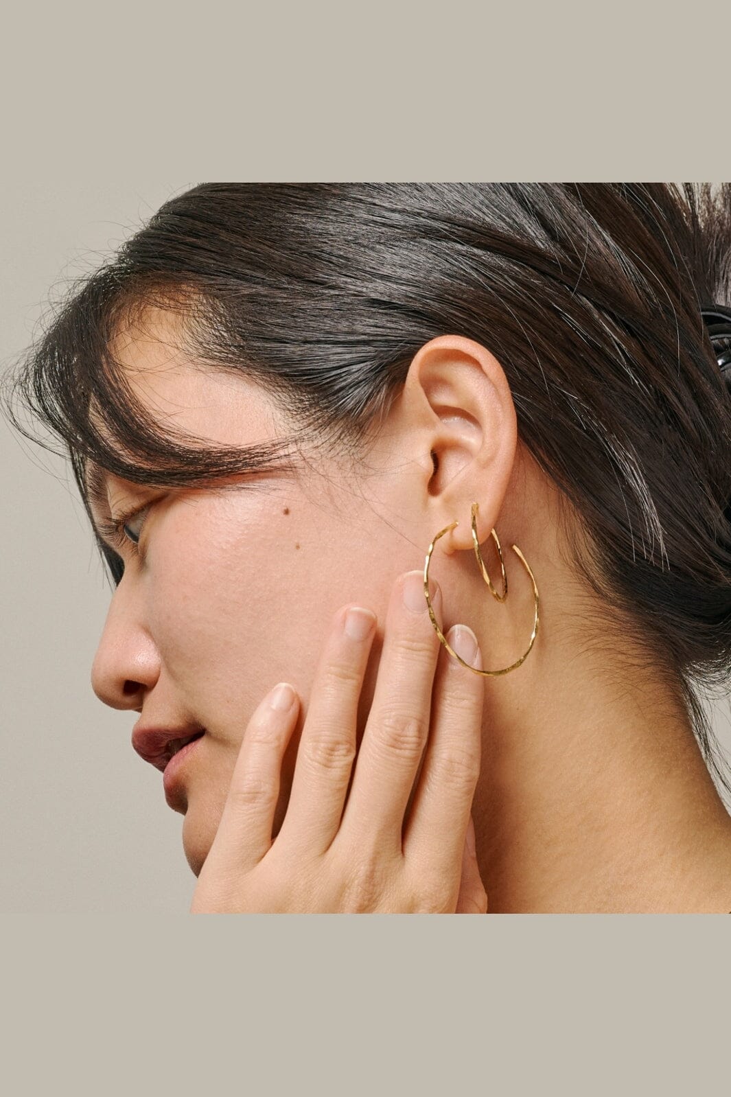 Hoops von Enamel Copenhagen mit einer organischen, unregelmäßigen Oberfläche. Die Ohrringe sind goldfarben und haben eine kreisförmige Form mit einem lebendigen Lichtspiel.