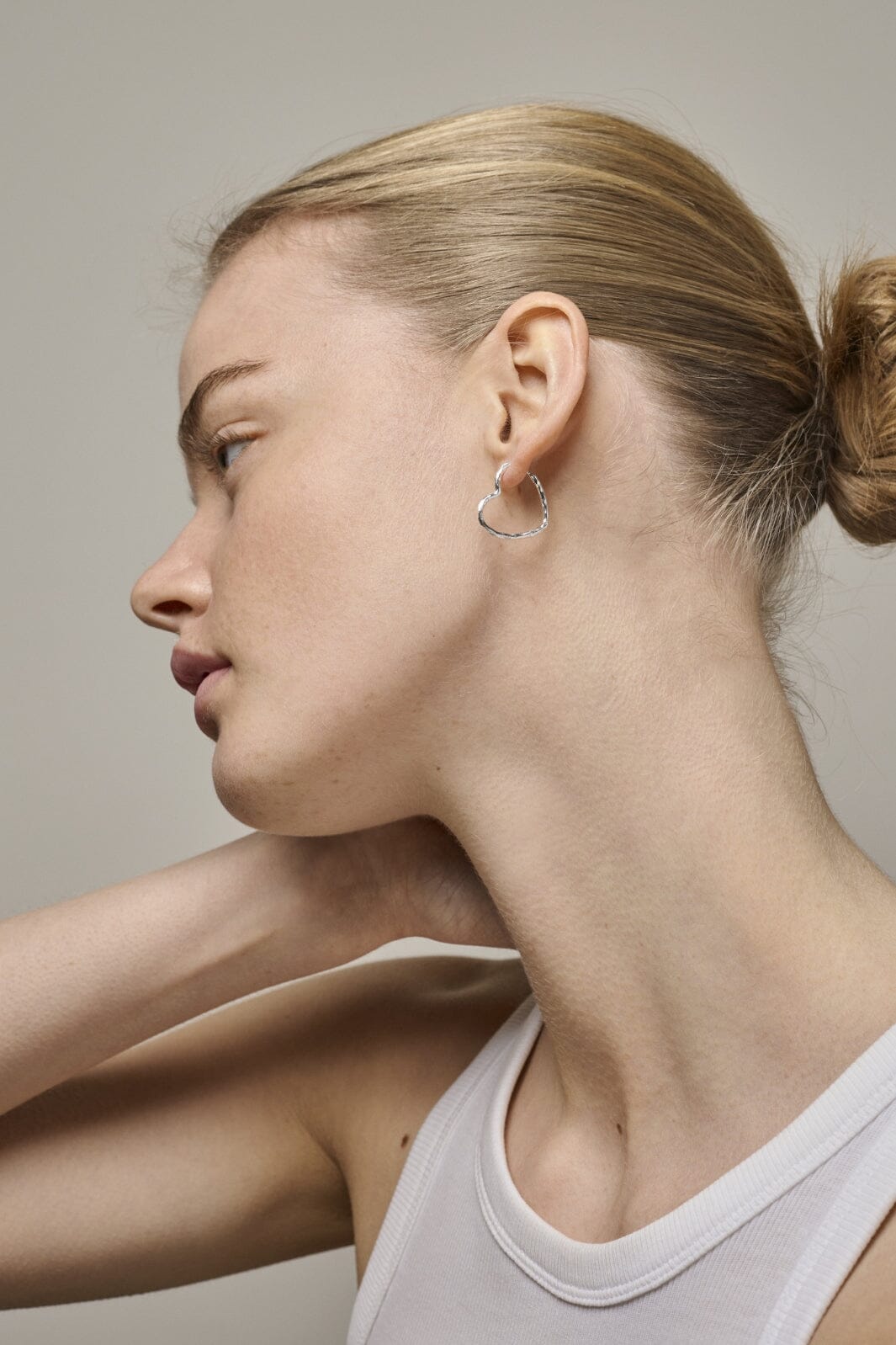 Herzförmige Ohrringe von Enamel Copenhagen mit einer besonderen strukturierten Oberfläche. Die handgefertigten Ohrringe sind von der Seite sichtbar und haben eine deutliche Herzsilhouette.