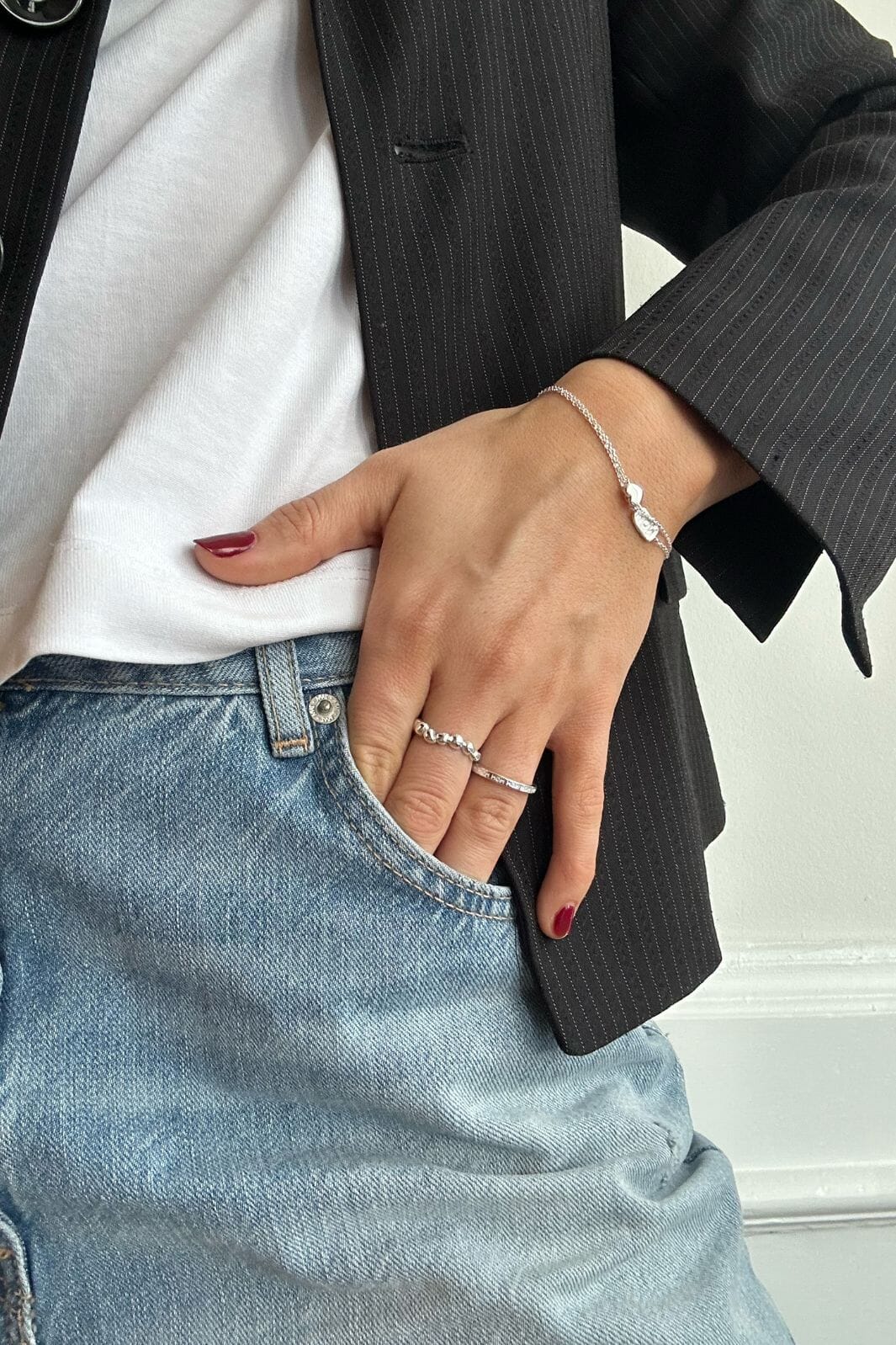 Ring von Enamel Copenhagen, gefertigt aus recyceltem Sterlingsilber. Der Ring hat ein Design mit kugelförmigen Segmenten in einem silberfarbenen Ton.
