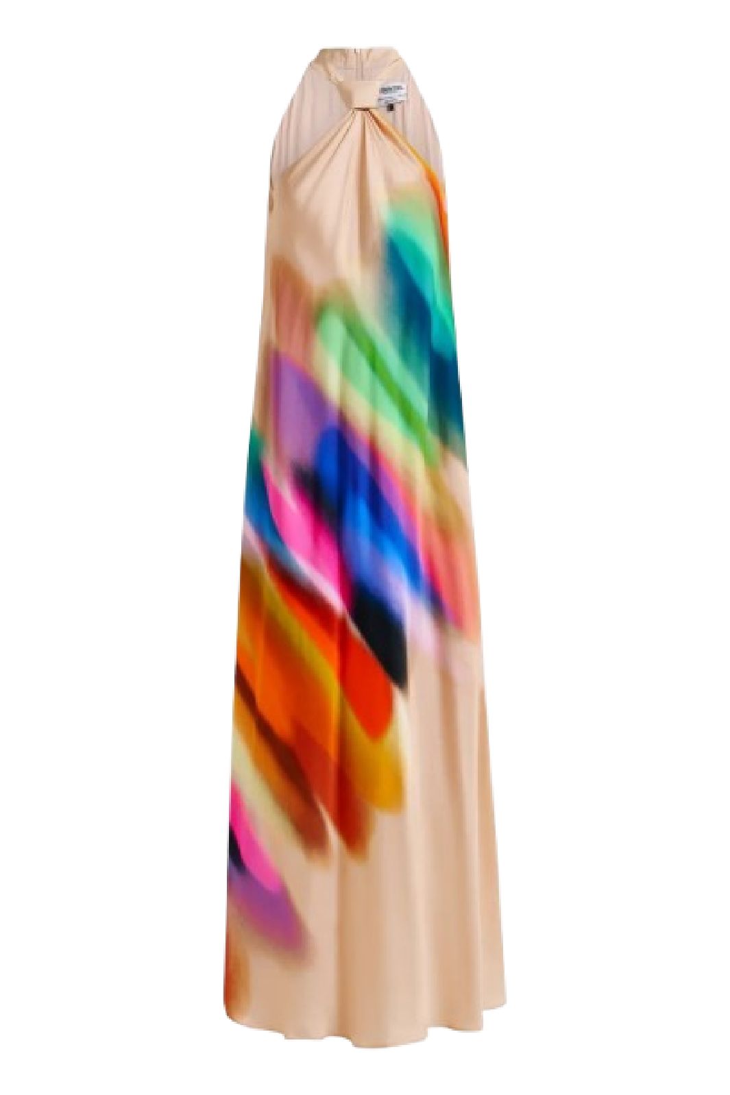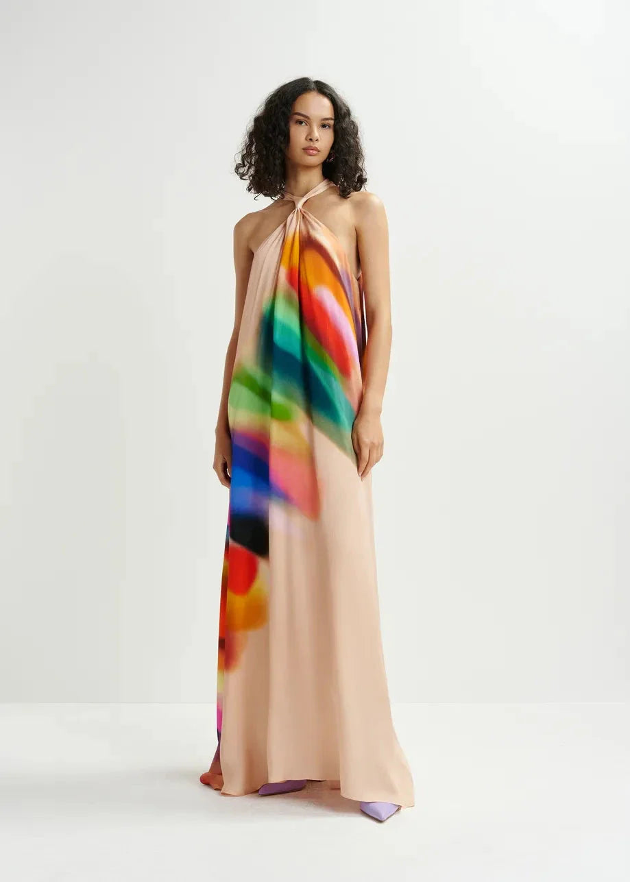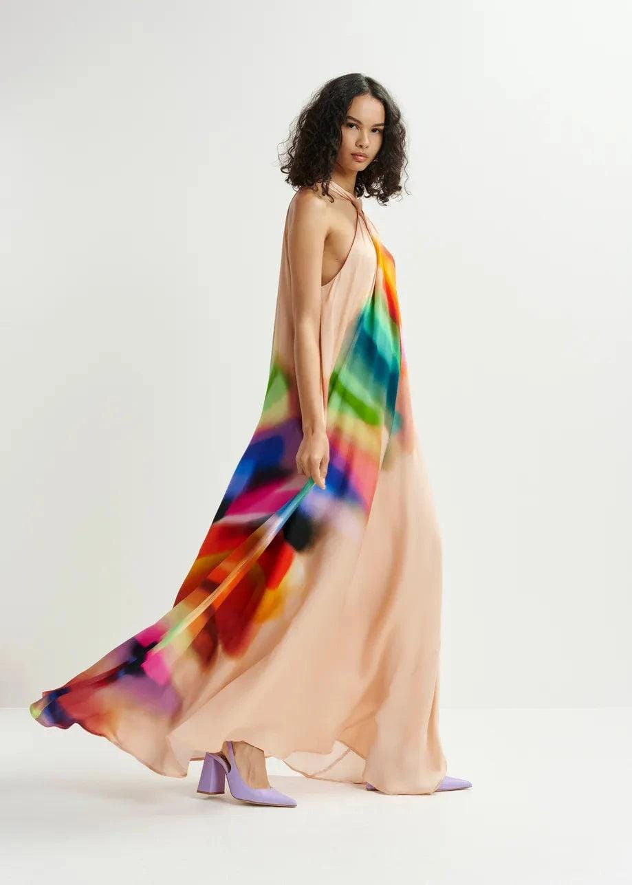 Lange Kleid von Essentiel Antwerp mit Halterneck und Farbverlauf-Muster. Das Kleid hat ein farbenfrohes Design mit sanften Übergängen zwischen den Farben Rot, Blau, Grün und Orange auf einem hellen Hintergrund.