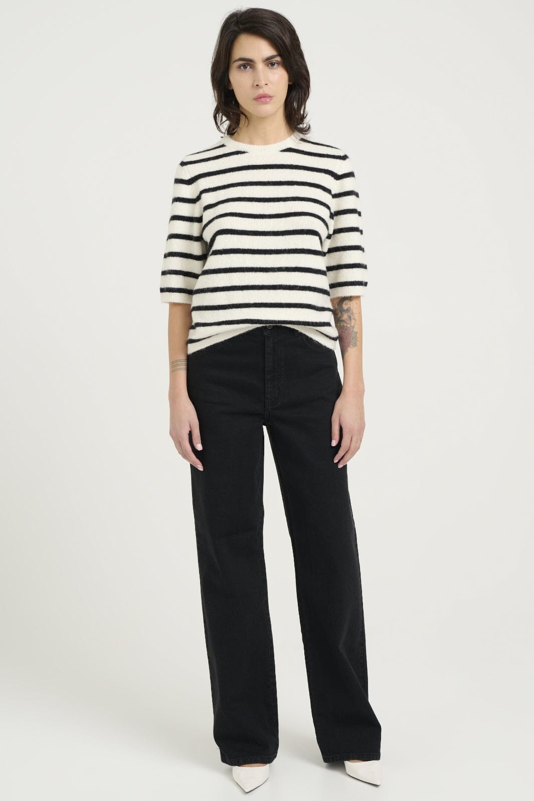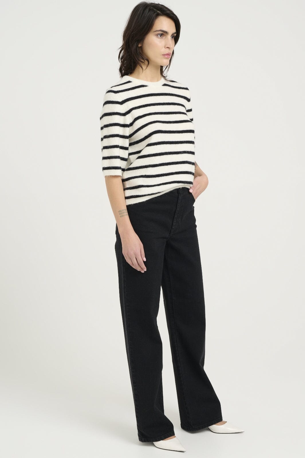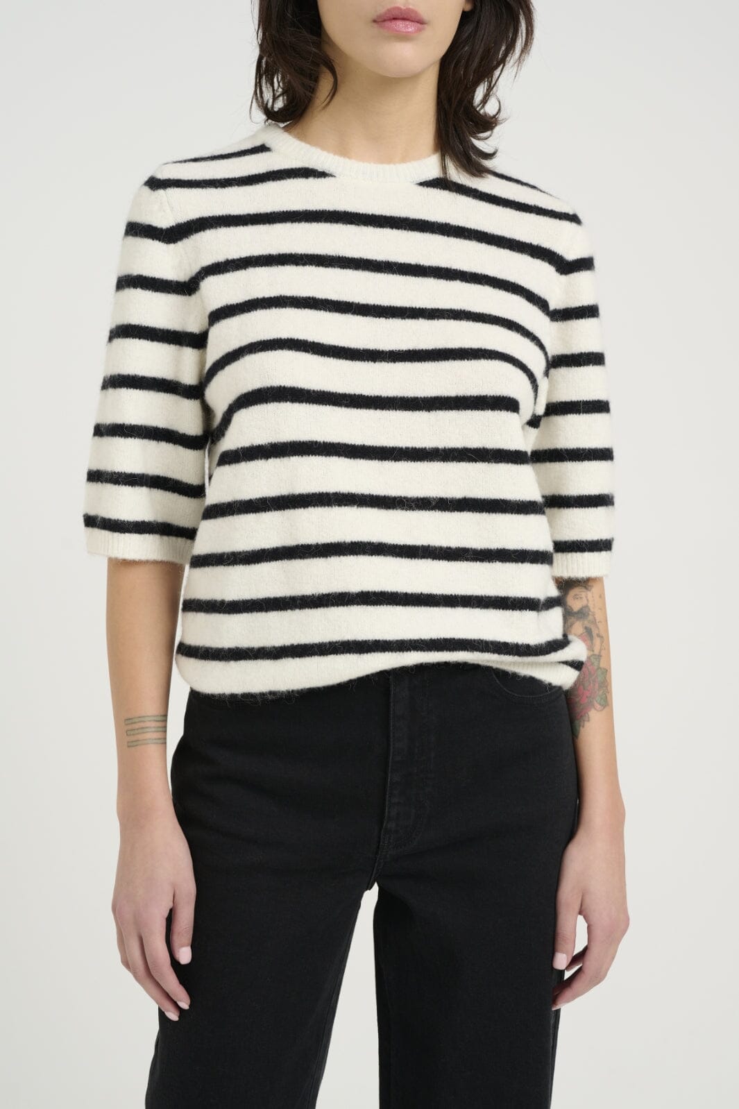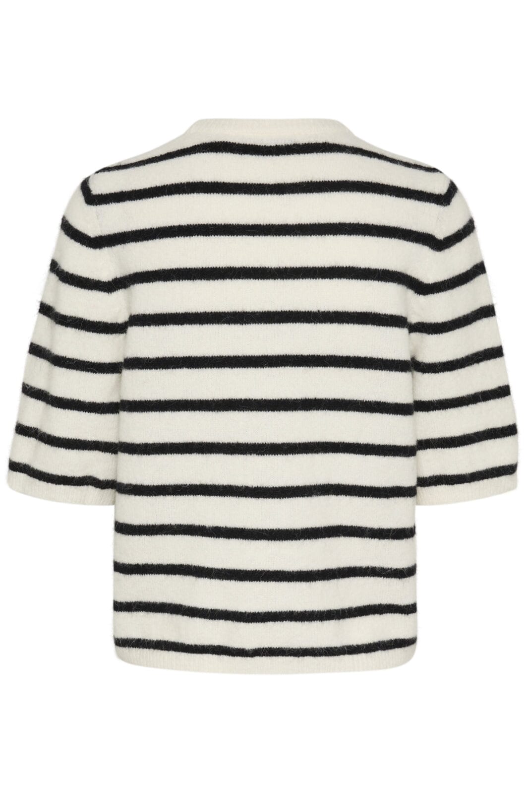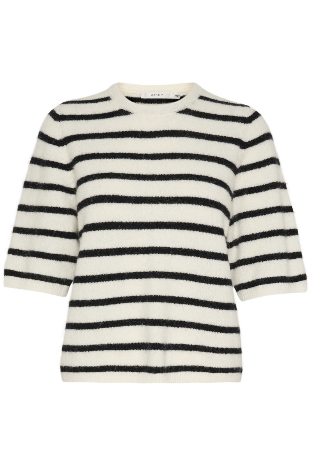 Gestuz gestreifte Bluse mit schwarz-weißen Streifen. Die Bluse hat 3/4-Ärmel und einen runden Hals. Sie besteht aus einer Mischung aus natürlichen und dehnbaren Materialien.