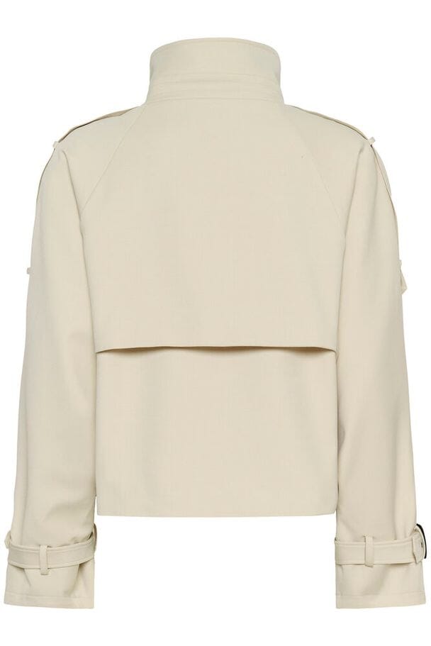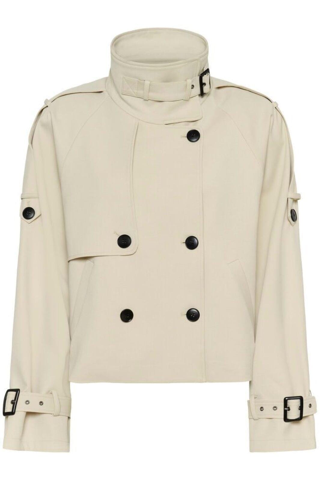 Kurzer Trenchcoat von Gestuz in Beige. Die Jacke hat ein doppelreihiges Design mit großen schwarzen Knöpfen und Schnallendetails am Kragen und an den Ärmeln.