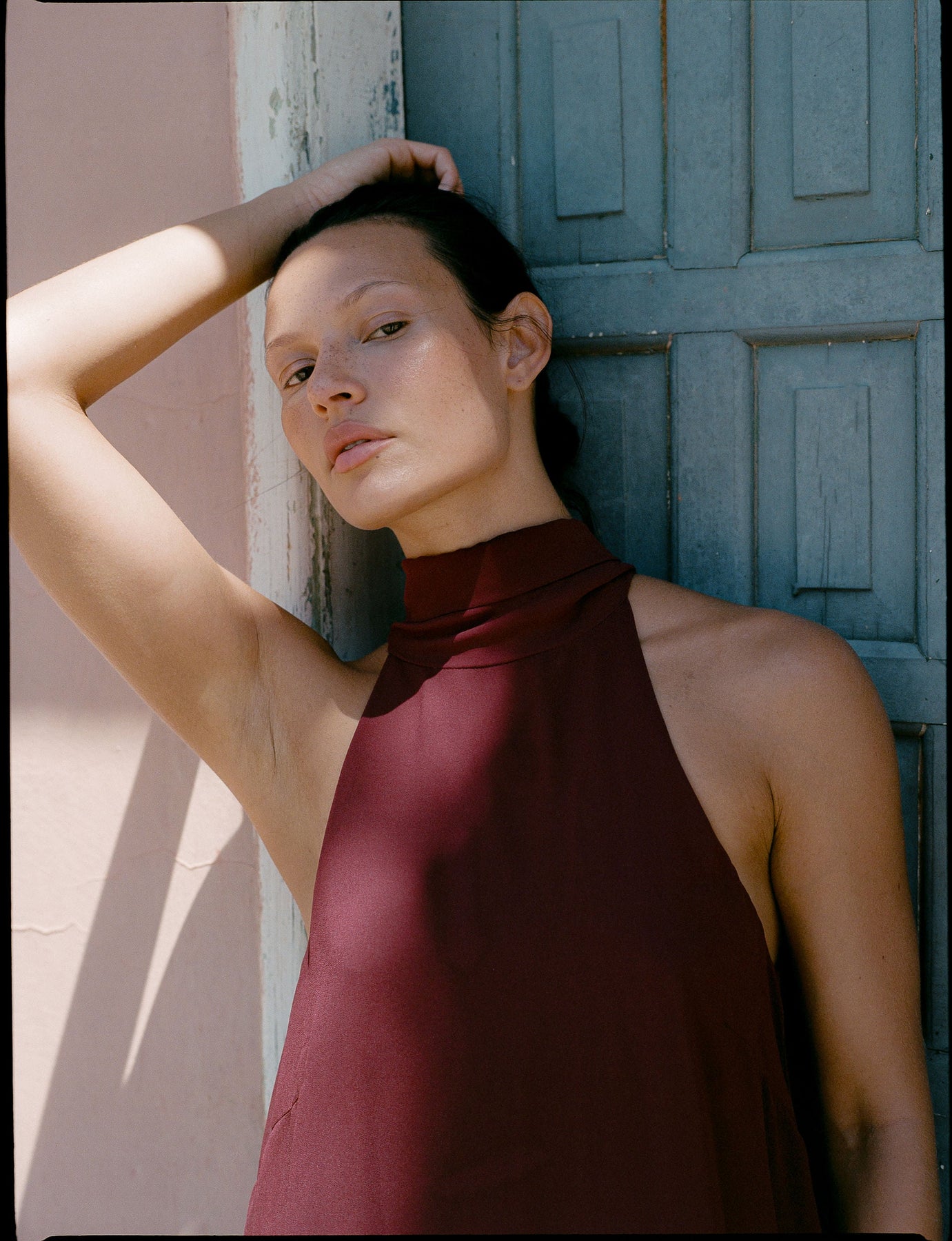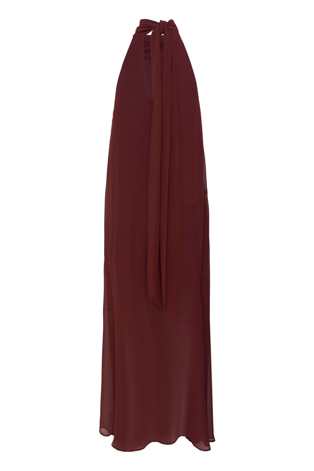 Kleid von Gestuz in einem tiefen Bordeauxrot. Das Kleid hat einen hohen Halsausschnitt, ist ärmellos und reicht mit einer lockeren Passform bis zu den Knöcheln.