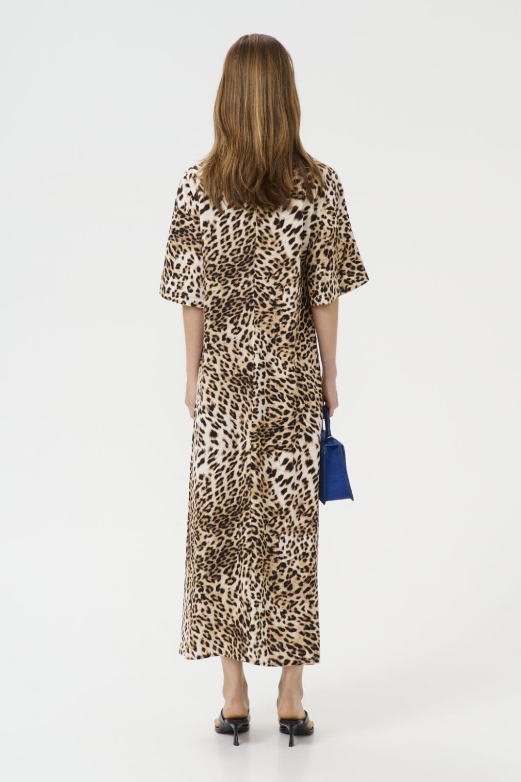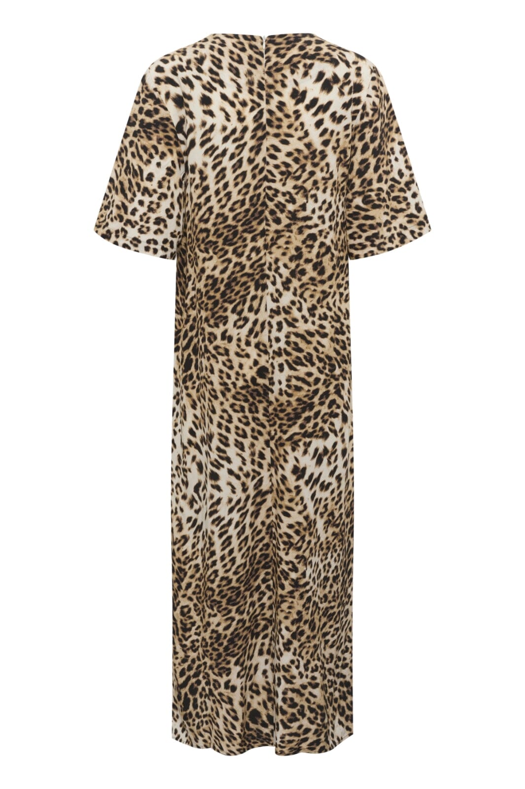 Maxikleid von Gestuz mit Leopardenmuster in hellgelben und braunen Nuancen. Das Kleid hat einen runden Halsausschnitt und kurze Ärmel mit einer geraden Silhouette von oben bis unten.
