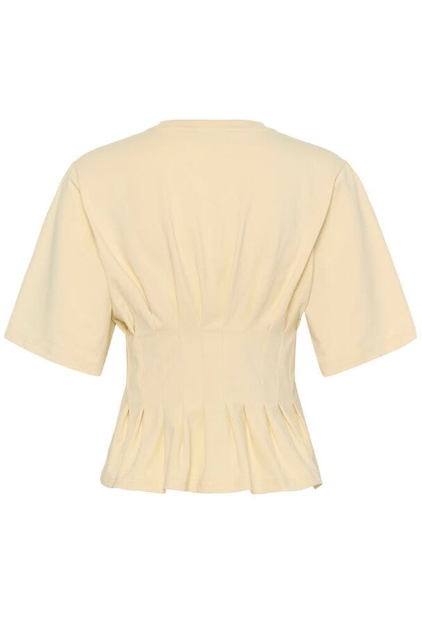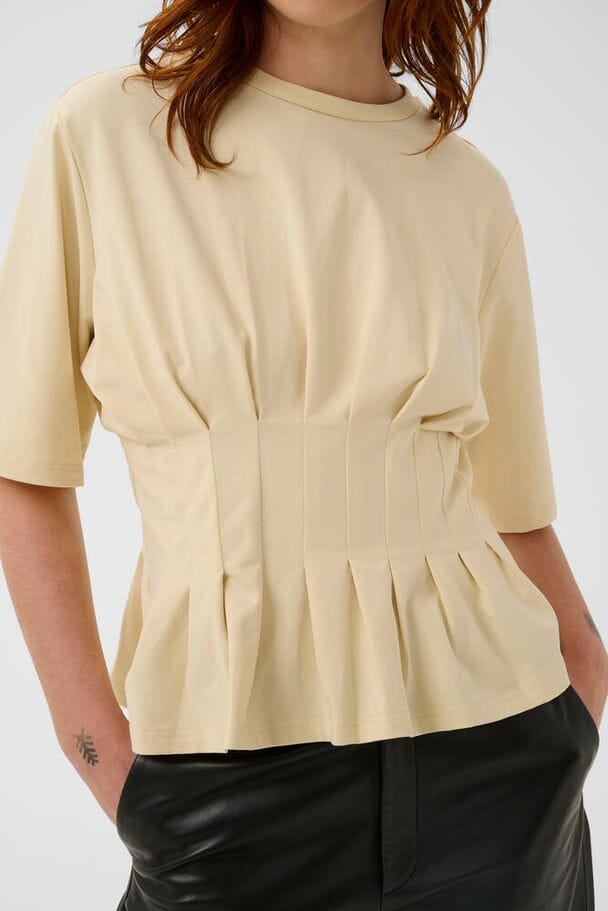 Ein hell cremefarbenes T-Shirt von Gestuz mit plissiertem Design in Taillenhöhe. Es hat kurze Ärmel und einen Rundhalsausschnitt.