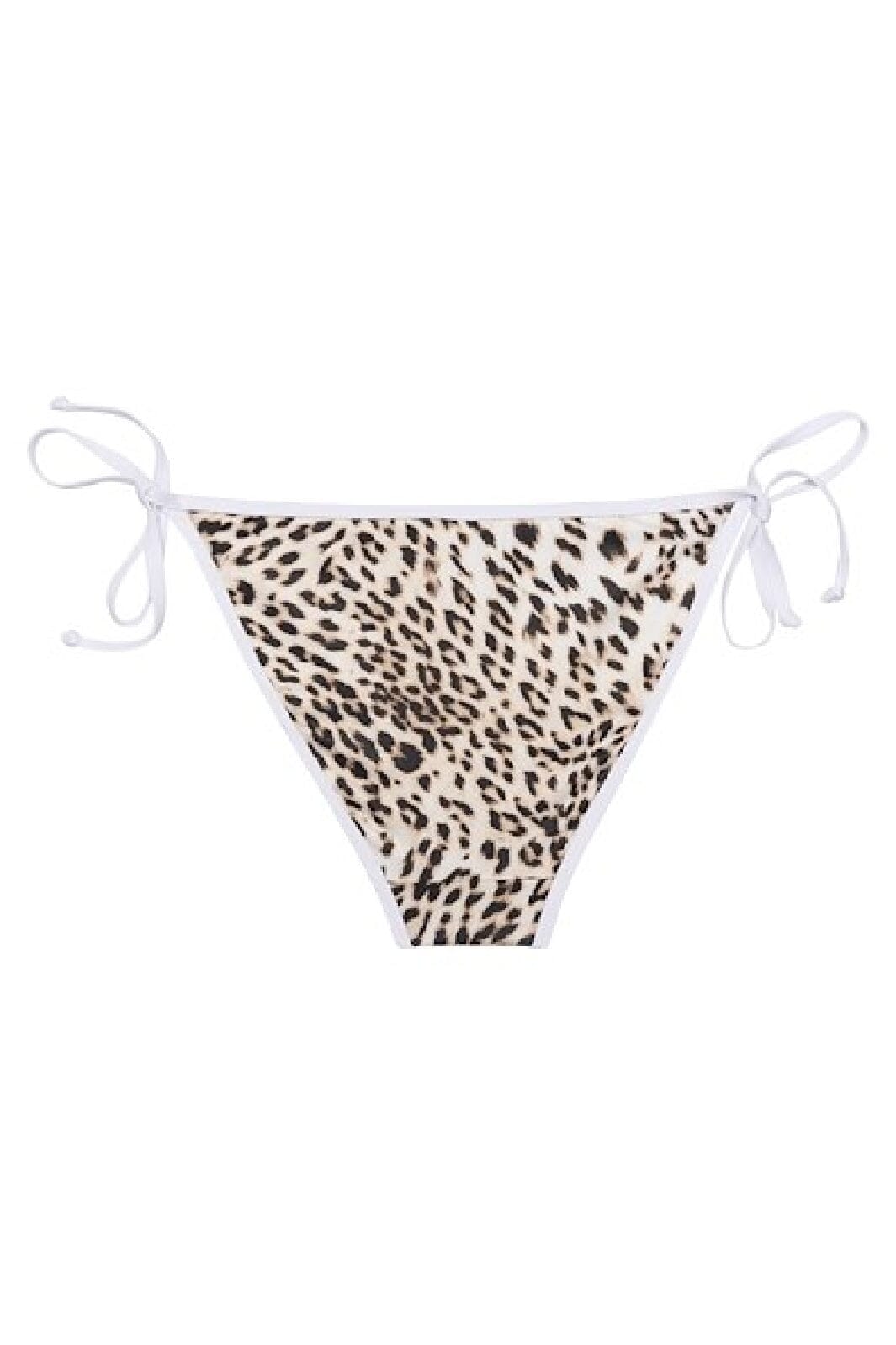 Bikiniunterteil von Gestuz mit hellem Leopardenmuster und weißen Kanten. Es hat Bindebänder an den Seiten und besteht aus recyceltem Polyester mit Elasthan für gute Beweglichkeit.
