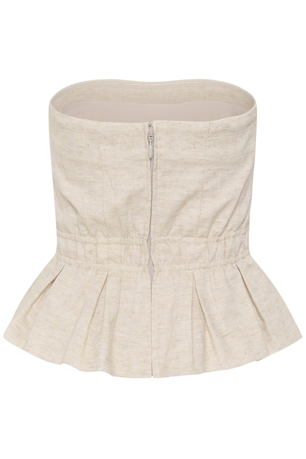 Schulterloses Korsagentop von Gestuz in einem hellen Sandton. Gefertigt aus einer Mischung aus Lyocell und Leinen mit gerüschtem Peplum-Saum.