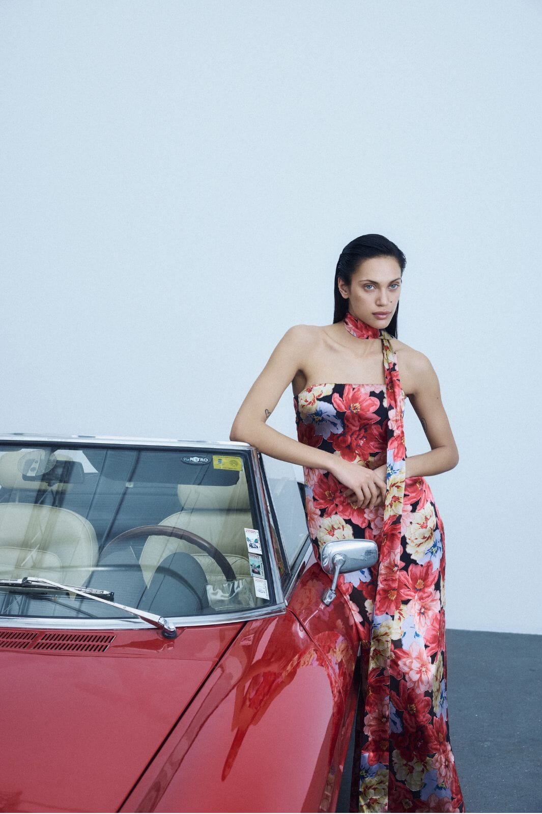 Kleid von Gestuz mit Blumenprint in roten, gelben und blauen Nuancen. Das Kleid hat eine knöchellange Silhouette und eignet sich für Hochzeiten und festliche Anlässe.