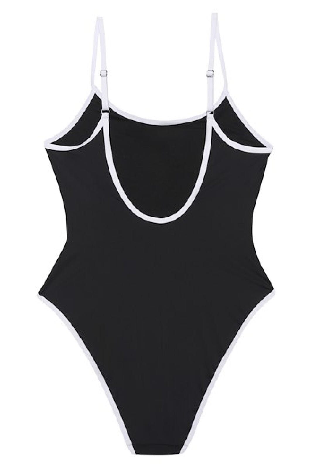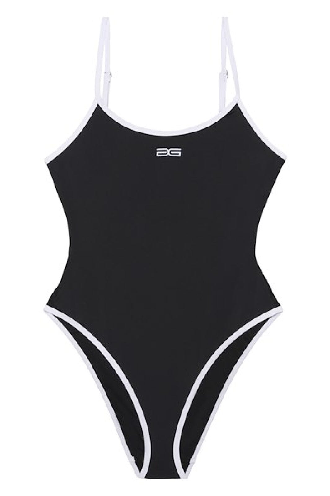Schwarzer Badeanzug von Gestuz mit weißen Kontrastdetails. Der hohe Beinausschnitt und die dünnen Träger schaffen einen sportlichen Stil, während die dekorative Naht feine Details hinzufügt.