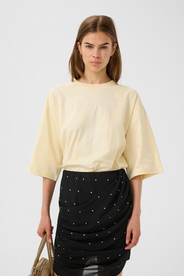 Hellgelbes T-Shirt von Gestuz aus 100 % Bio-Baumwolle. Das T-Shirt hat ein gesticktes Detail auf der Brust und eine oversized Passform.