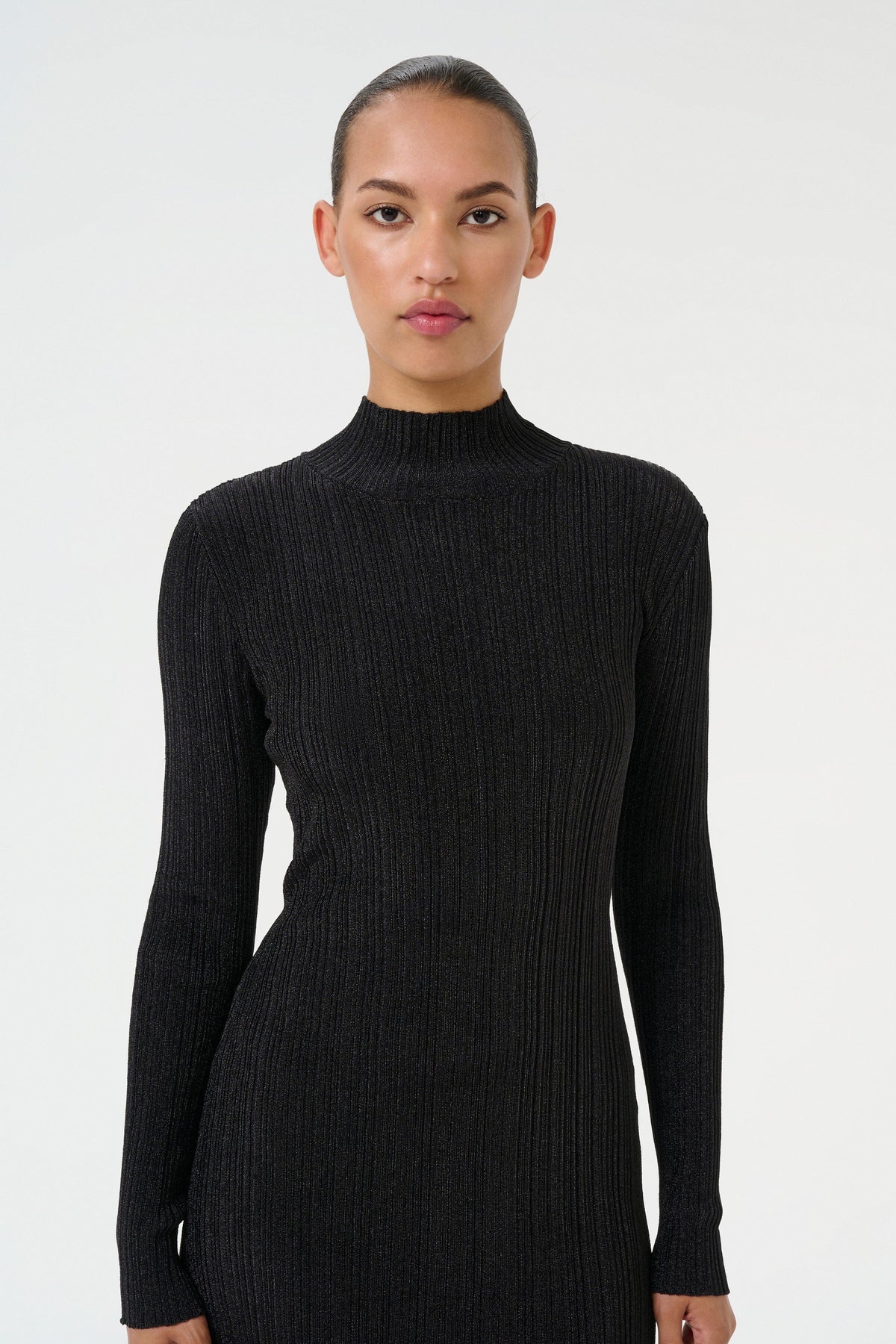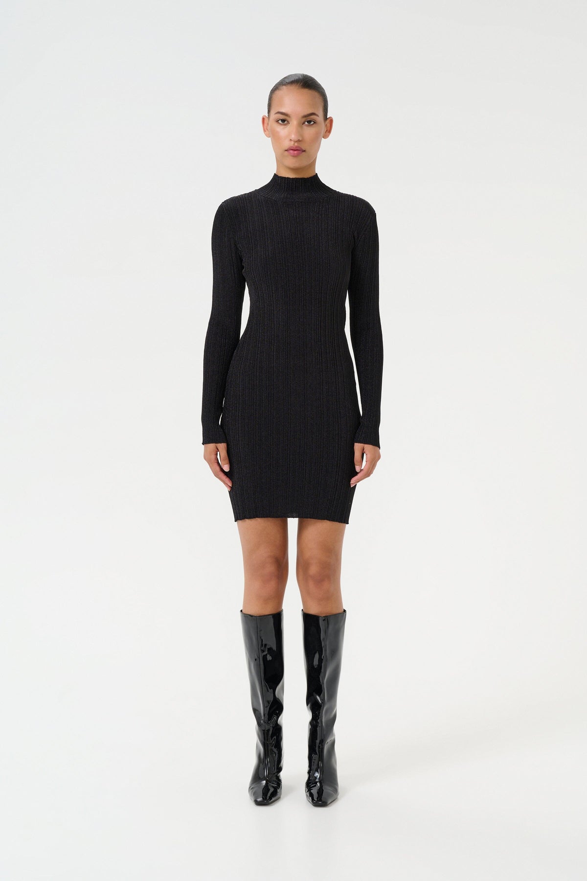 Schwarzes Kleid von Gestuz mit gerippter Textur. Der hohe Kragen und die langen Ärmel verleihen dem Kleid einen klaren Ausdruck. Das Kleid endet am Oberschenkel und hat eine figurbetonte Passform.