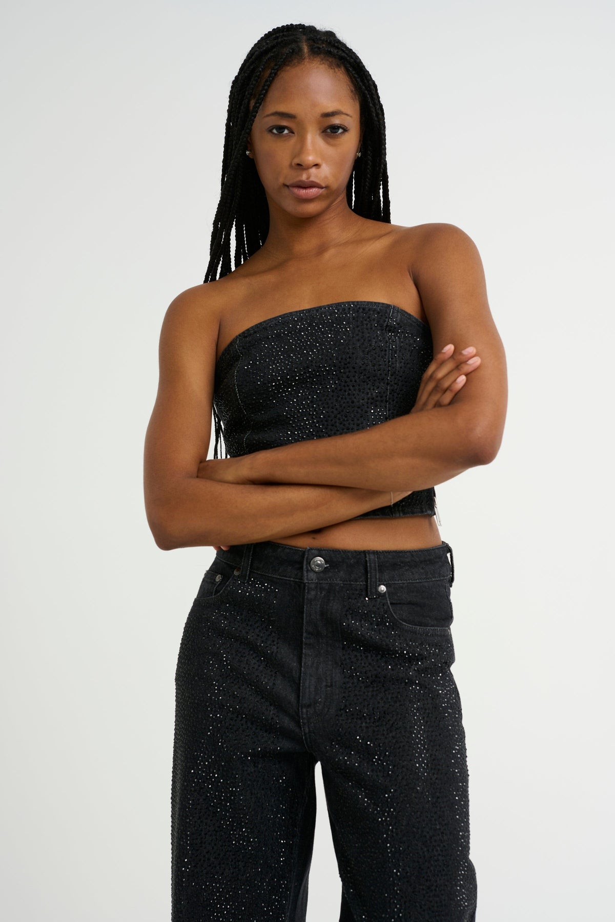Strapless Corsage von Gestuz in dunkelgrauer gewaschener Nuance mit schwarzen Steinen. Das Oberteil hat Pailletten und Rüschen über das gesamte Design sowie einen Off-Shoulder-Schnitt.