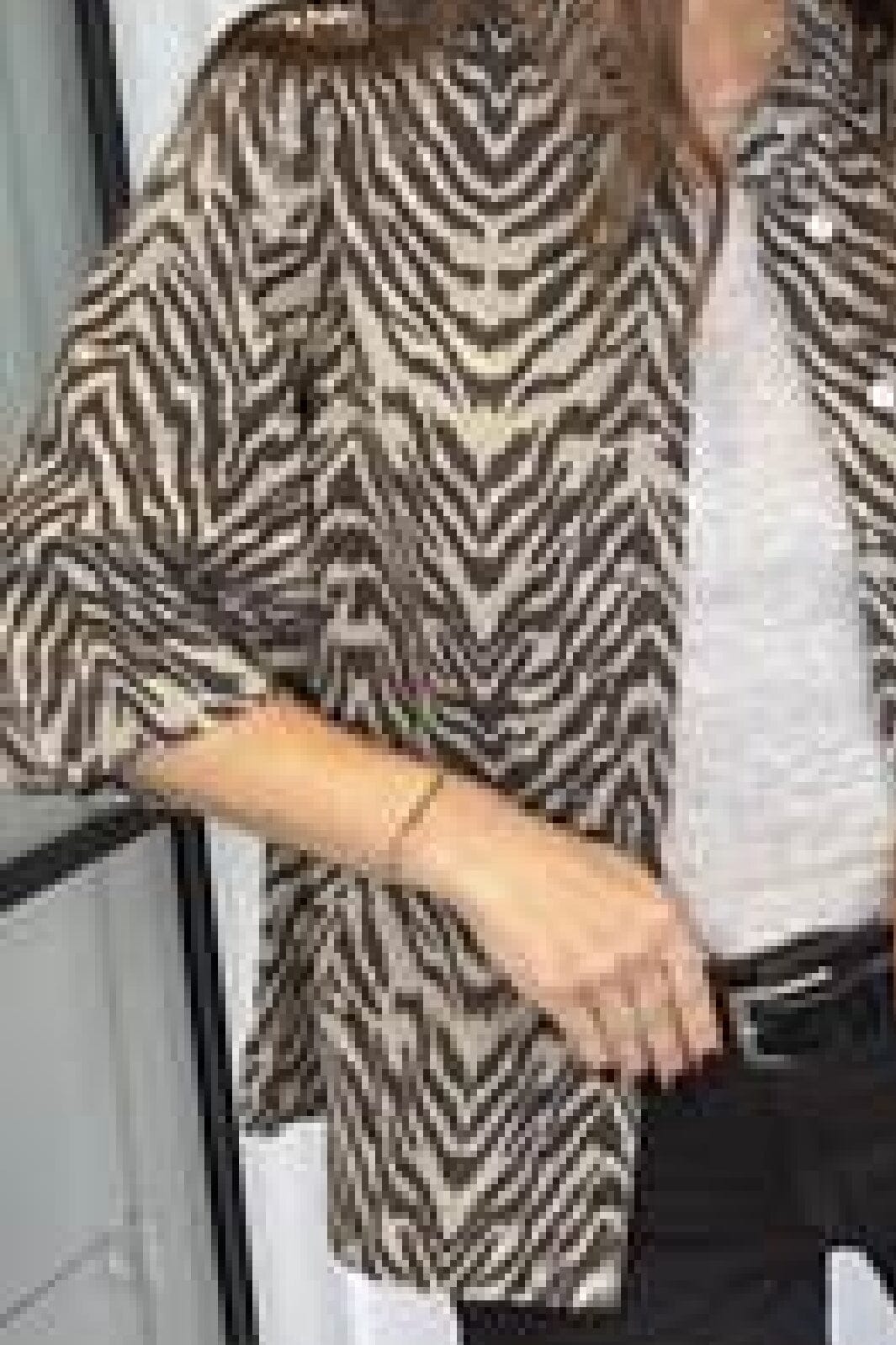 Hemd von Global Funk mit einem charakteristischen Zebramuster in Braun und Beige. Sie hat einen Hemdkragen und 3/4-Ärmel für gute Bewegungsfreiheit.