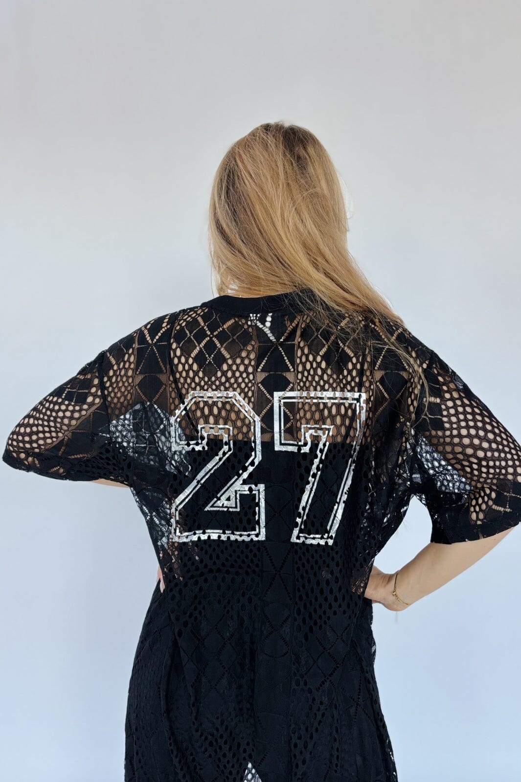 Schwarzes T-Shirt-Kleid von Gossia mit geometrischen Mustern aus netzähnlichem Stoff. Das Kleid hat kurze Ärmel und einen runden Ausschnitt mit Stickerei und Spitzen-Details im gesamten Design.