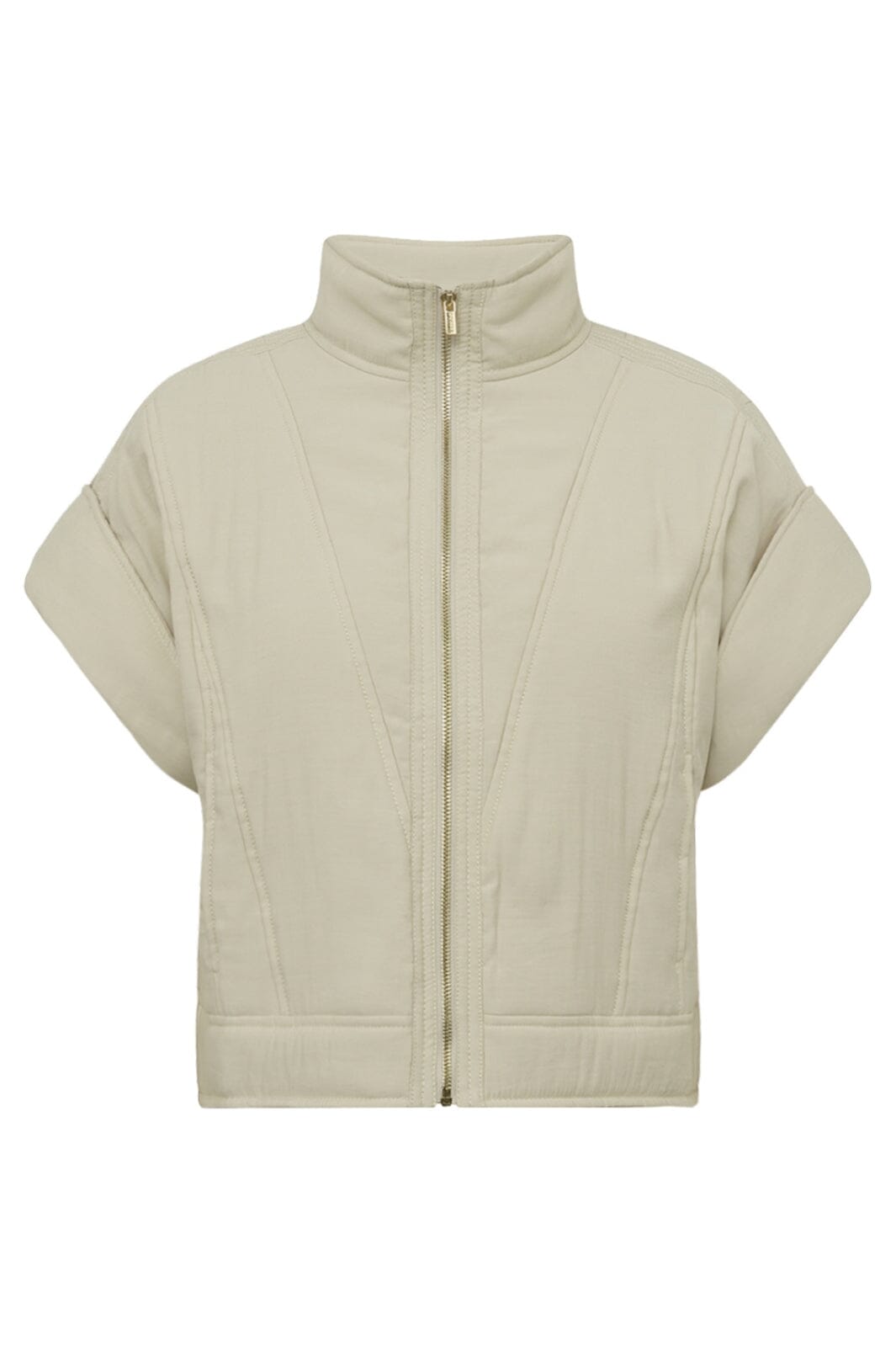 Cremfarbene Weste von Gossia mit hohem Kragen und Reißverschluss vorne. Die Weste hat kurze, gerollte Ärmel und dekorative Nähte, die dem Design Struktur verleihen.