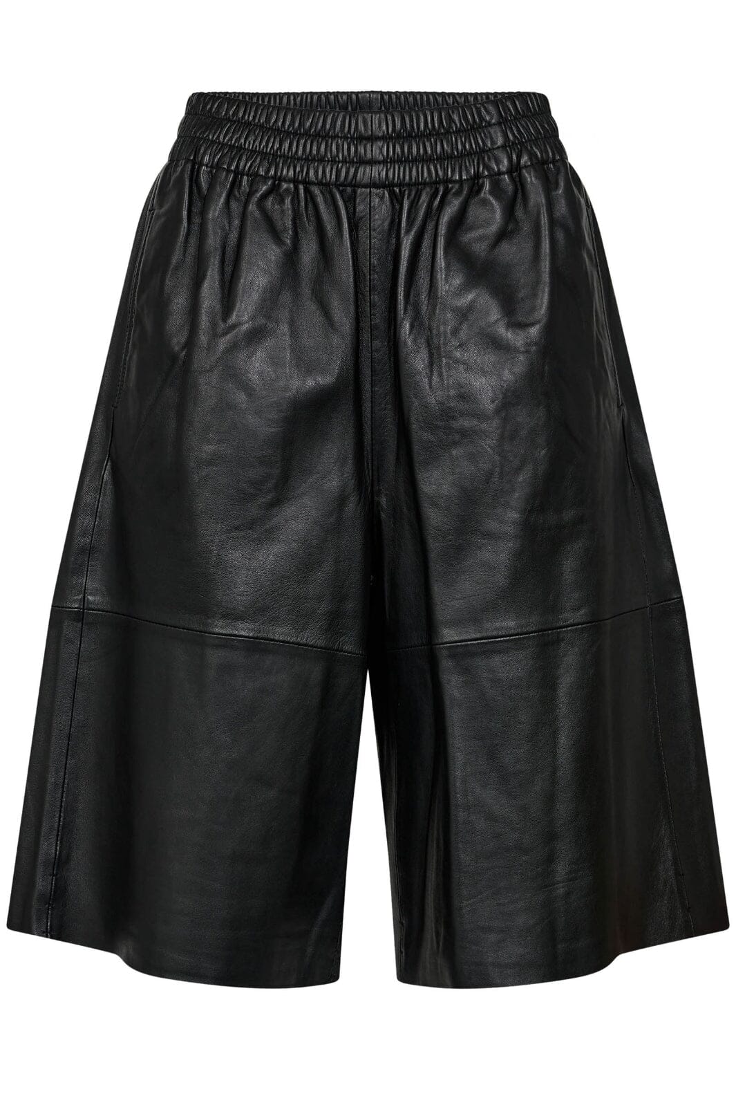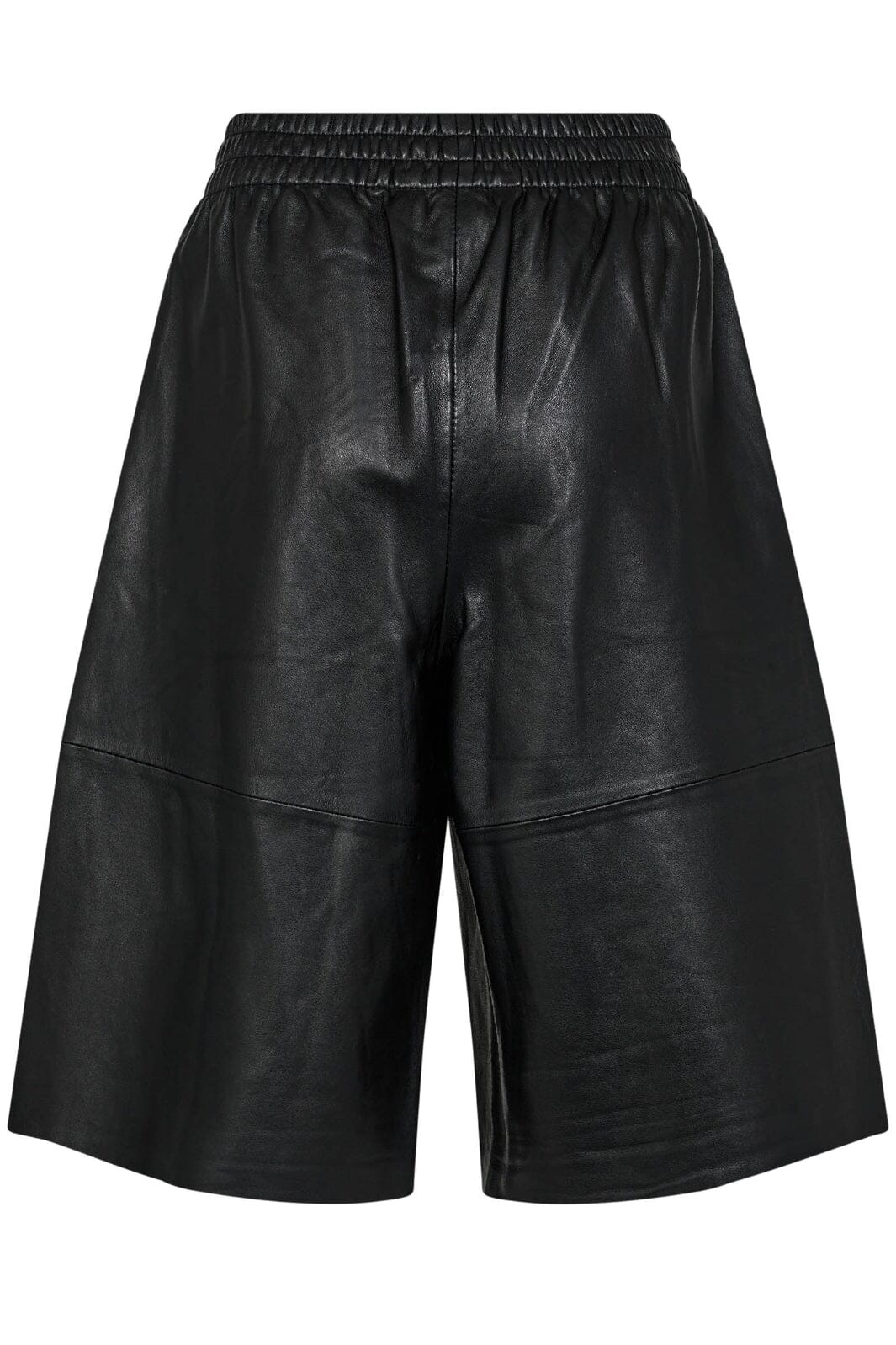 Schwarze Bermudashorts von Gossia aus Lammleder. Die Shorts haben einen breiten Beinabschluss und knielange Länge mit elastischem Bund.