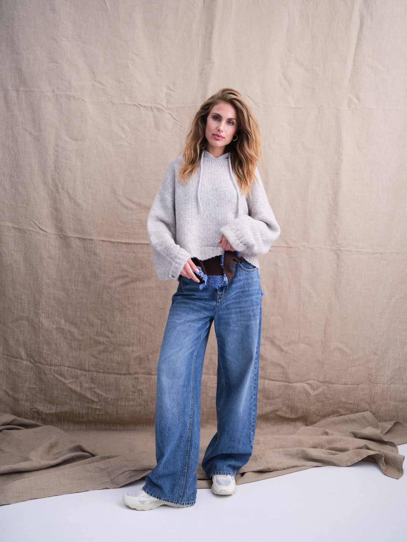 Hoodie-Pullover von Gossia in hellgrau melierter Farbe mit Strickstruktur und Kapuze mit Kordelzug.