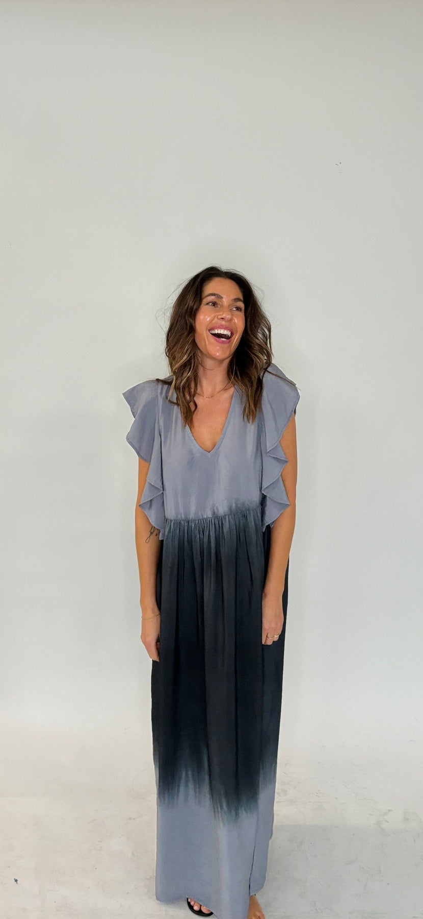 Knöchellanges Kleid von Gossia mit Dip-Dye-Effekt in Grautönen. Das Kleid hat einen V-Ausschnitt und Rüschärmel, die ihm einen sanften und femininen Ausdruck verleihen.