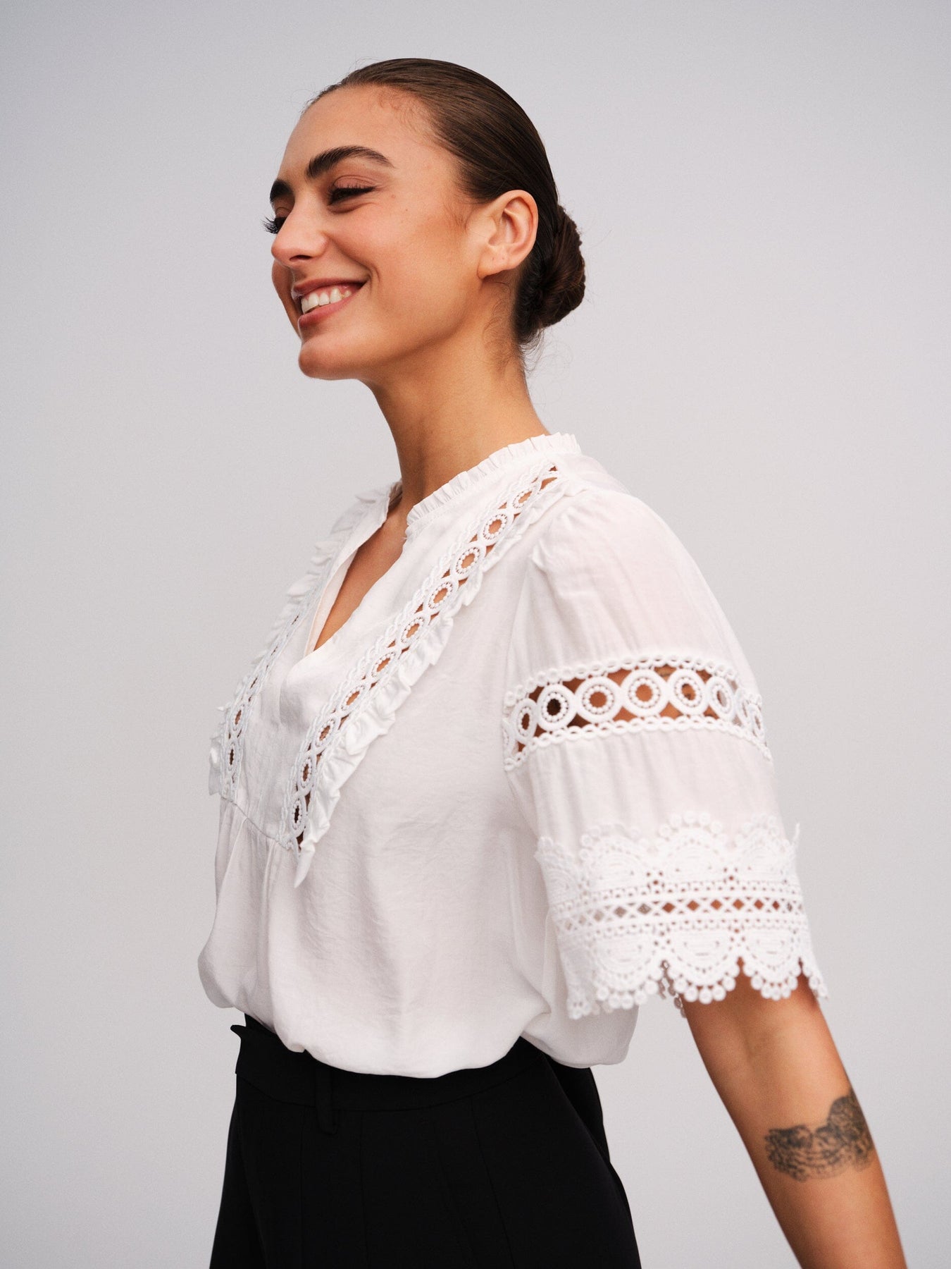 Bluse von Gossia in Off-White. Sie besteht aus 57% Polyamid und 43% Viskose mit Spitzen- und Volantdétails.