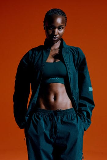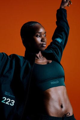 Schwarzer Sport-BH von Halo mit breiten Trägern und rundem Halsausschnitt. Der BH hat einen reflektierenden Druck mit HALO- und ATW-Logo.