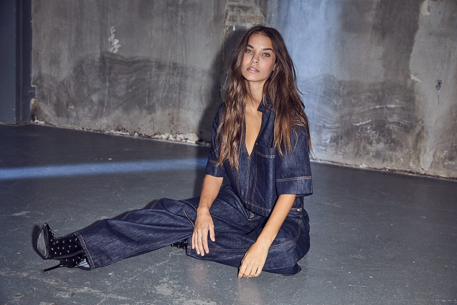 Denimtop von Haute L'Amitié aus rohem, dunkelblauem Denim. Das Top hat einen tiefen V-Ausschnitt mit Hemdkragen und sichtbaren Kontrastnähten.