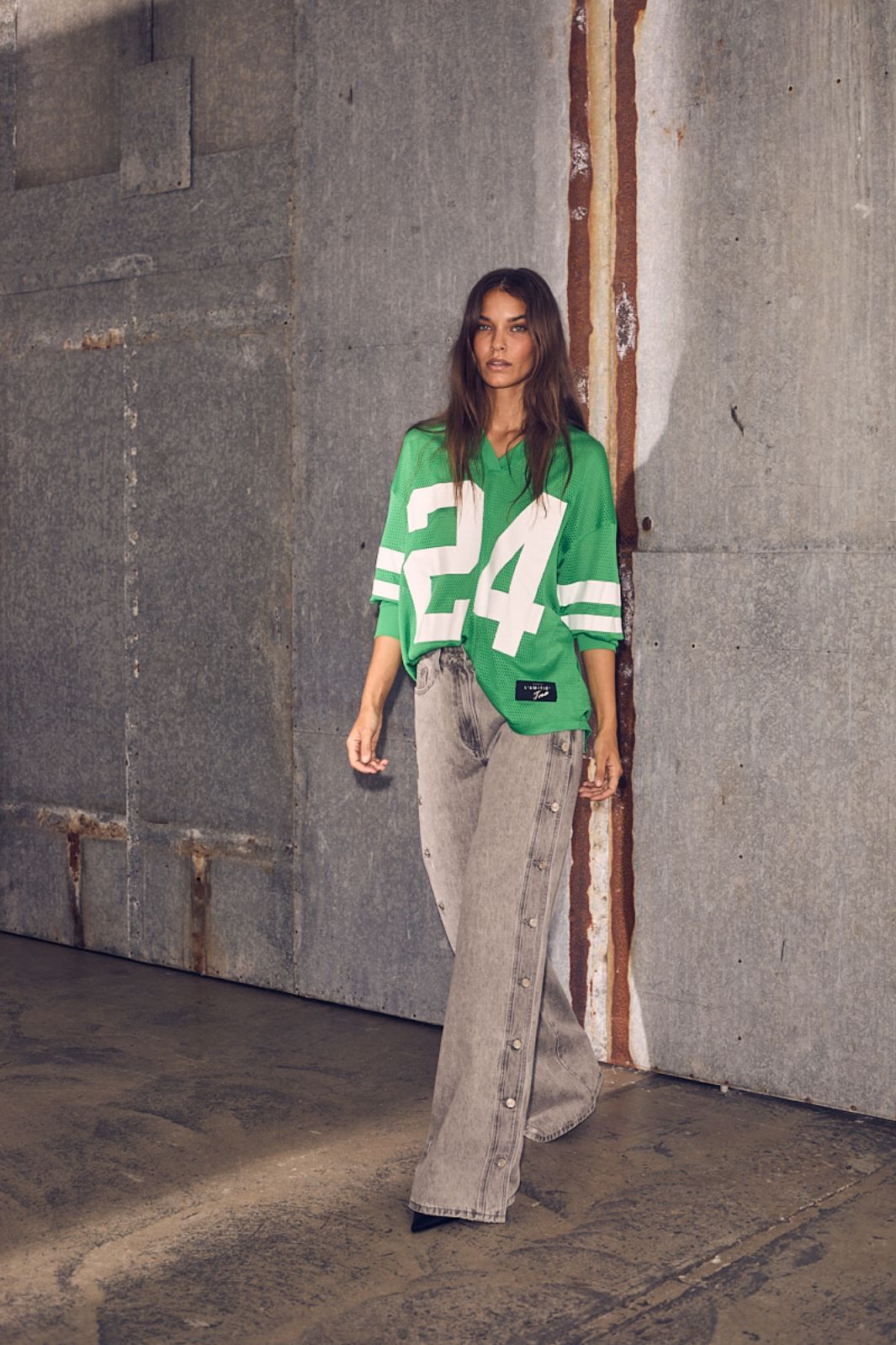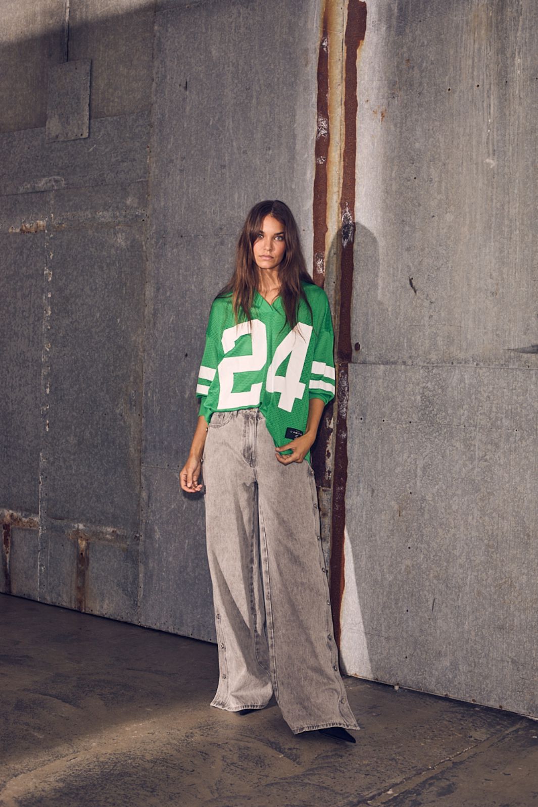 Grünes langärmliges T-Shirt von Haute L'Amitié mit Mesh-Design. Das T-Shirt hat eine oversized Passform und eine große Nummer 24 auf der Vorderseite zusammen mit weißen Streifen an den Ärmeln.