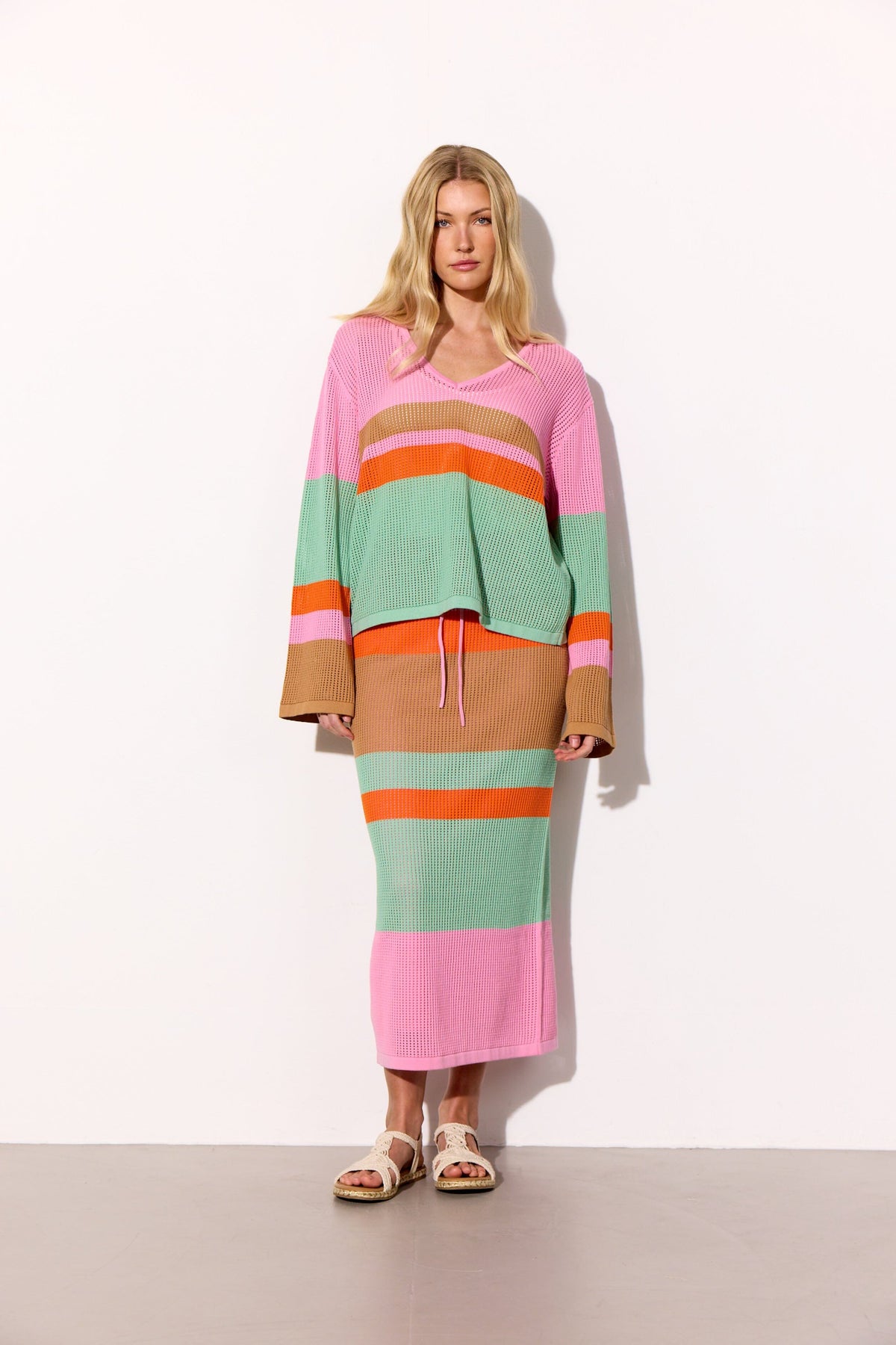 Bluse von Hunkøn mit Streifen in Pink, Mintgrün, Orange und Braun. Sie hat eine Mesh-Strickstruktur und eine lockere Passform.