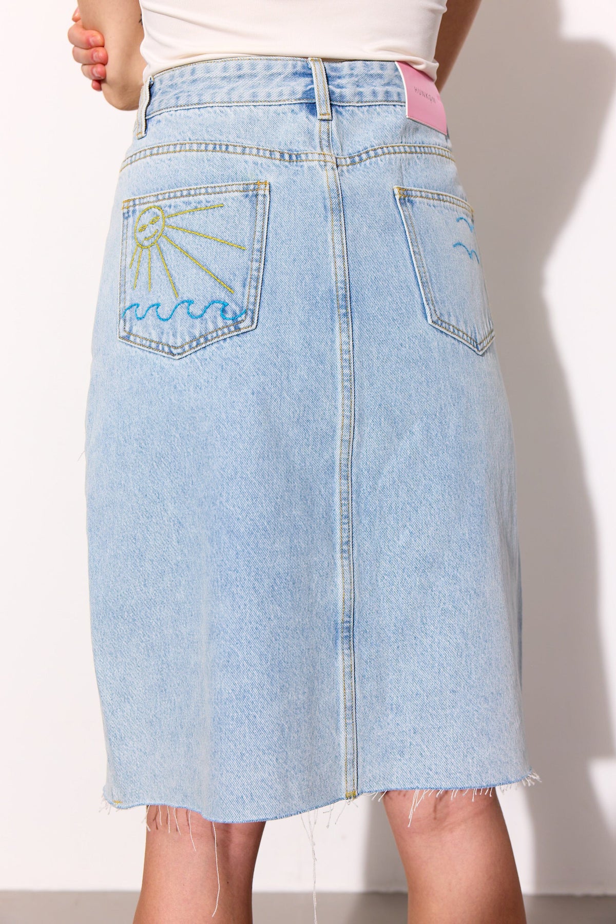 Jeansrock von Hunkøn aus hellblauem Denim. Der Rock hat vorne ausgefranste Details und Stickereien auf den Gesäßtaschen mit Sonnen- und Wellenmotiv.
