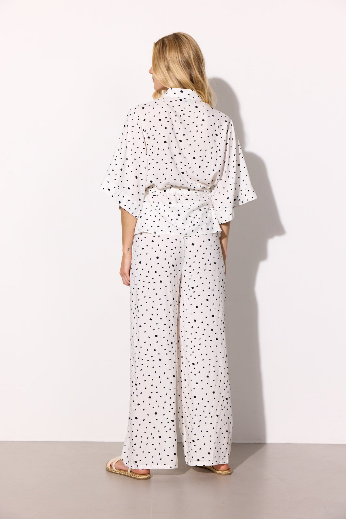 Weiße Kimono-Bluse von Hunkøn mit schwarzen Punkten. Die Bluse hat einen klassischen Hemdkragen und weite Ärmel mit überschnittenen Schultern.