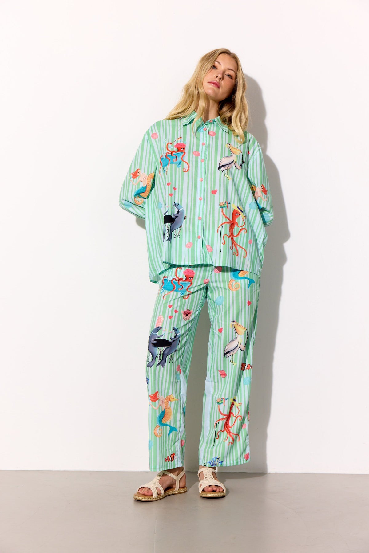 Hemd von Hunkøn im Green Ocean Art Print. Das mehrfarbige Muster kombiniert grüne und weiße Streifen mit meeresinspirierten Illustrationen von Tintenfischen, Seepferdchen und Vögeln.