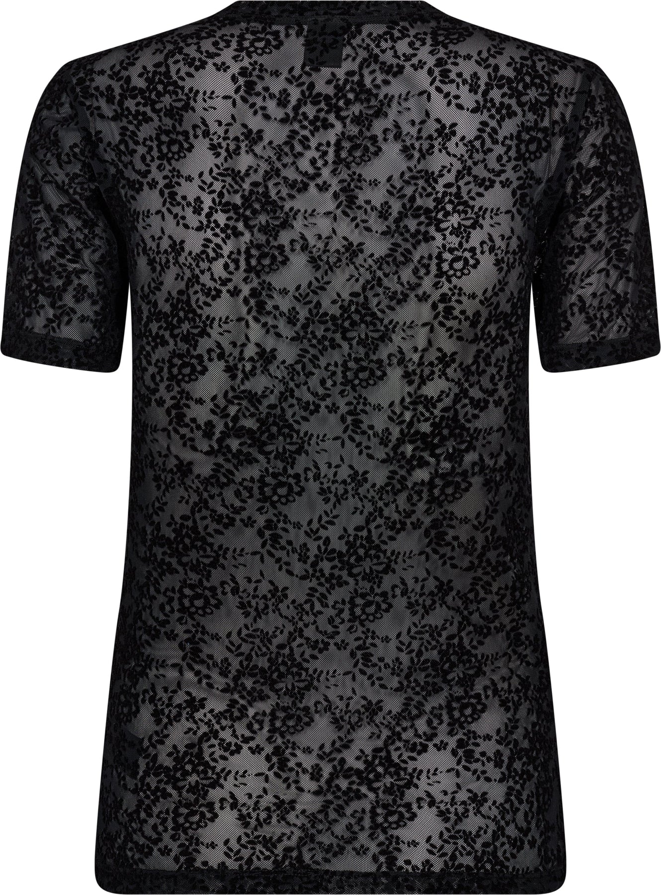 Schwarzes Spitzent-Shirt von Hype The Detail mit transparentem Blumenmuster. Es hat kurze Ärmel und eine figurbetonte Passform.
