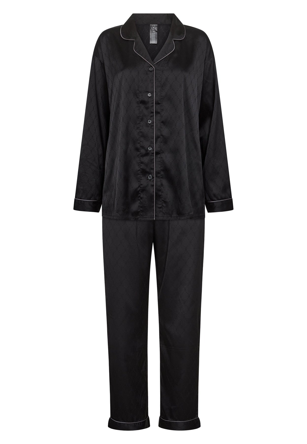 Schwarze Satinpyjamas von Hype The Detail mit Hemdkragen und langen Ärmeln. Das Set hat eine Bindeschleife und dekorative Nähte, die einen eleganten Look verleihen.