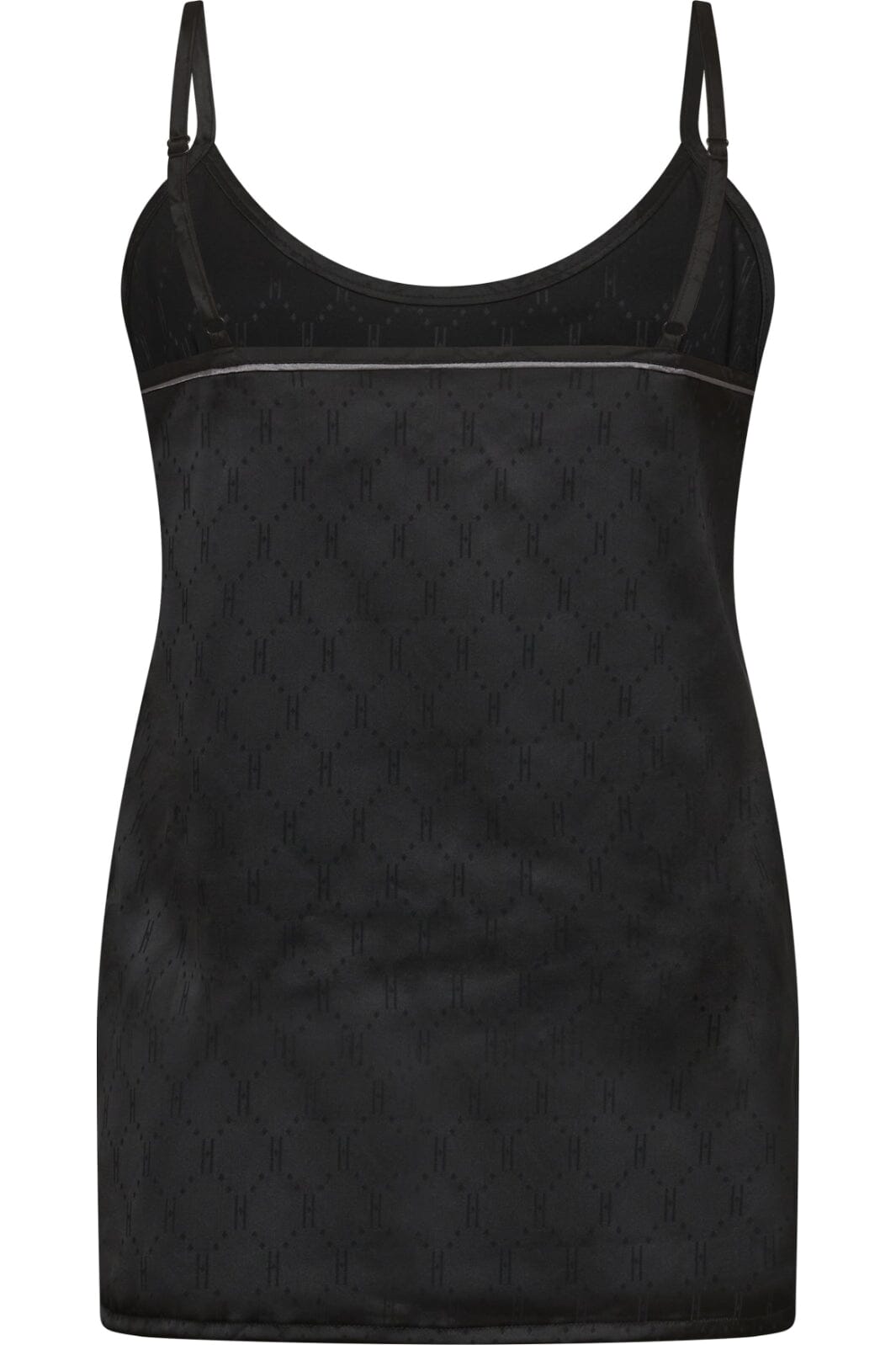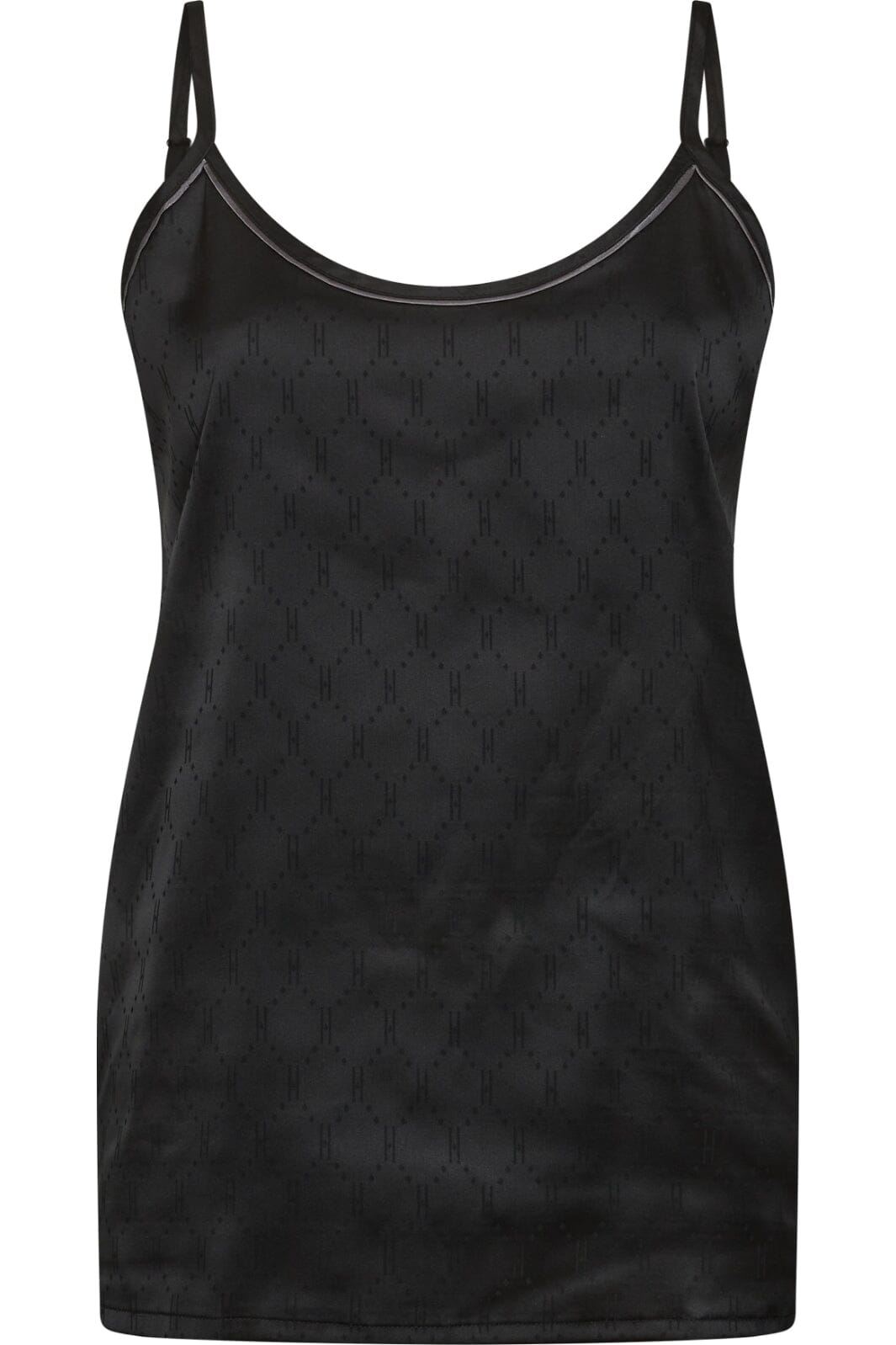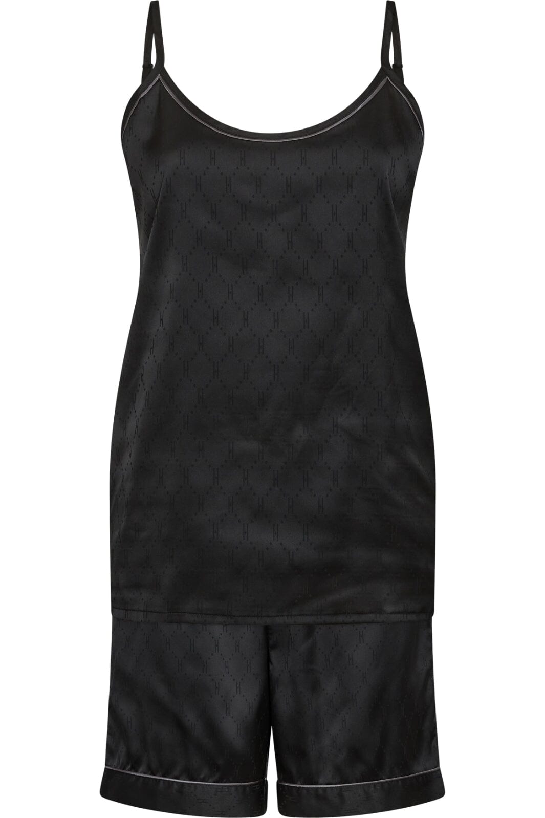 Schwarzes Satin-Set von Hype The Detail mit einem subtilen Muster im Stoff. Das Set besteht aus einem Top mit dünnen Trägern und Shorts mit elastischem Bund und Schnürung.