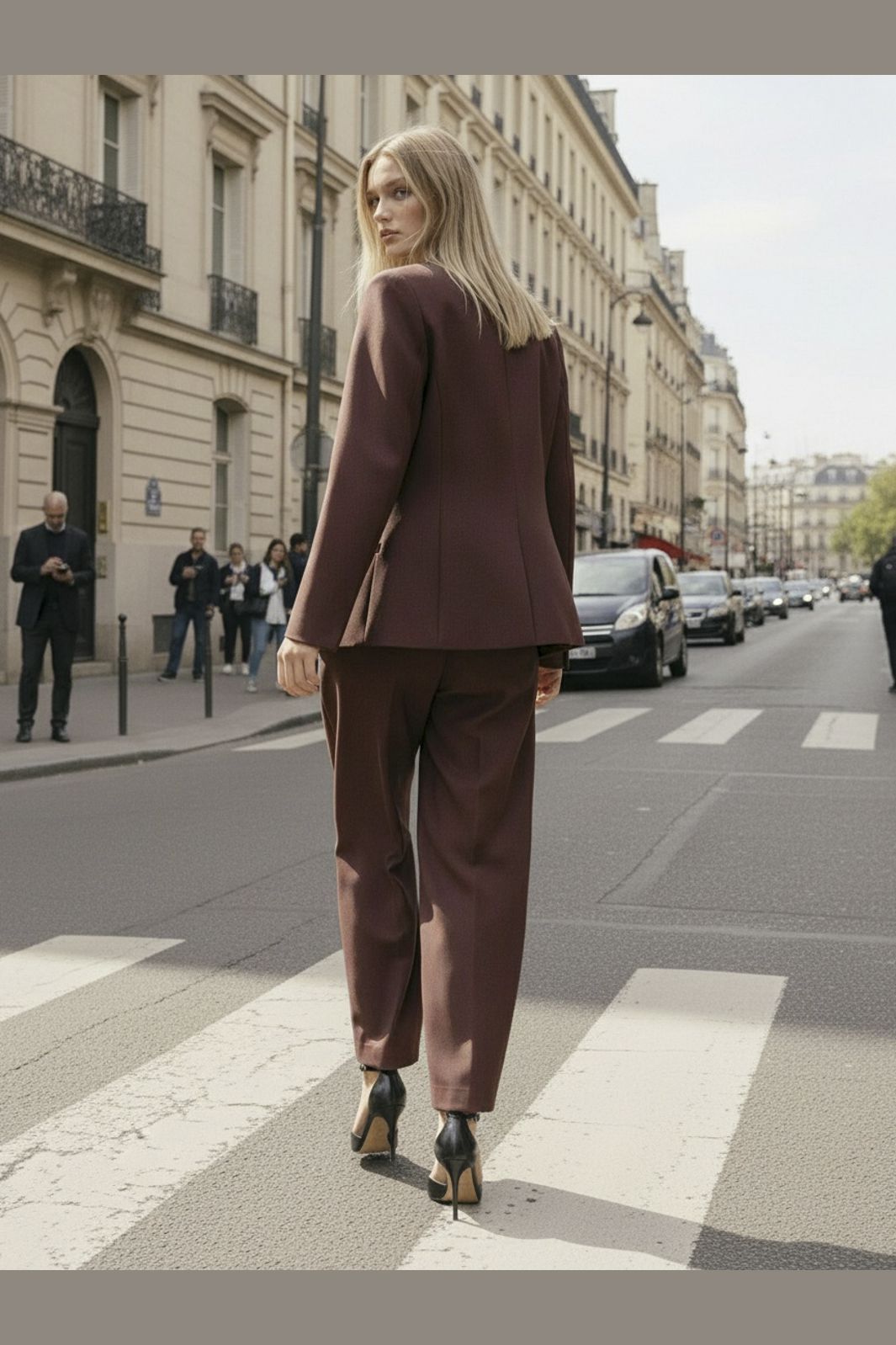 Braune Anzughosen von Hypedrop mit hoher Taille und Barrel-Fit-Passform. Die Hosen haben einen Knopf- und Reißverschluss sowie Gürtelschlaufen an der Taille und praktische Seitentaschen.