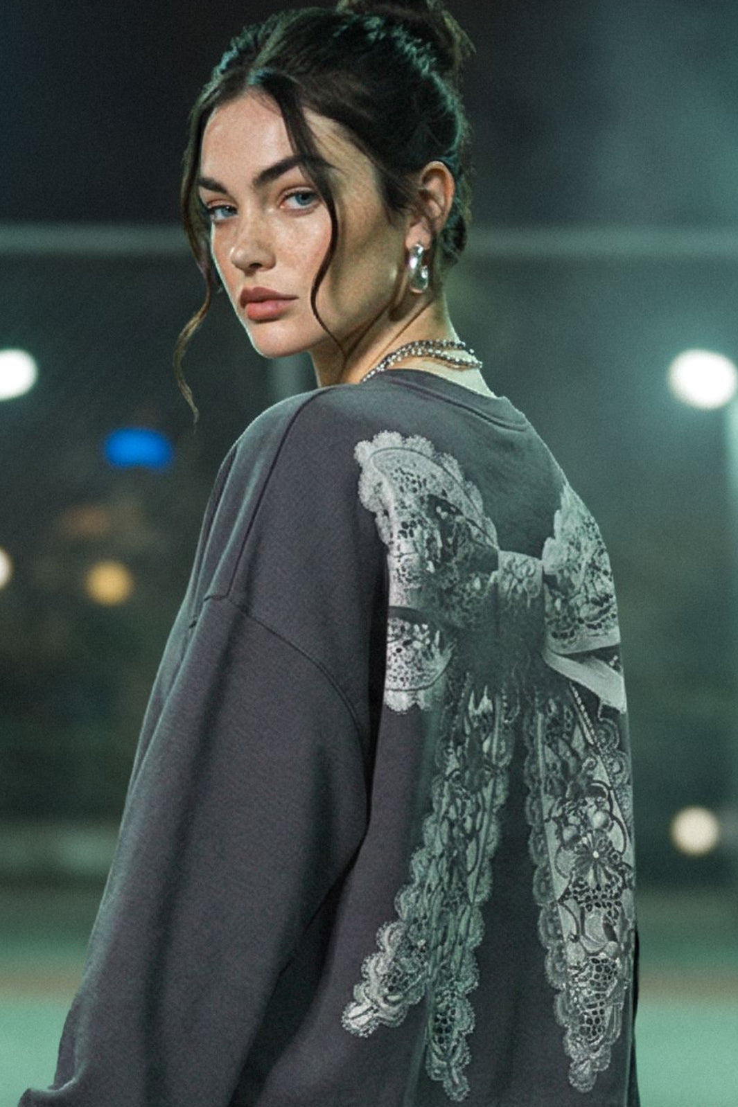 Cropped Sweatshirt von Hypedrop in Dunkelgrau. Sie hat einen Rundhalsausschnitt, lange Ärmel und einen dekorativen Print auf der Rückseite mit Schleifen- und Blumenmotiven.