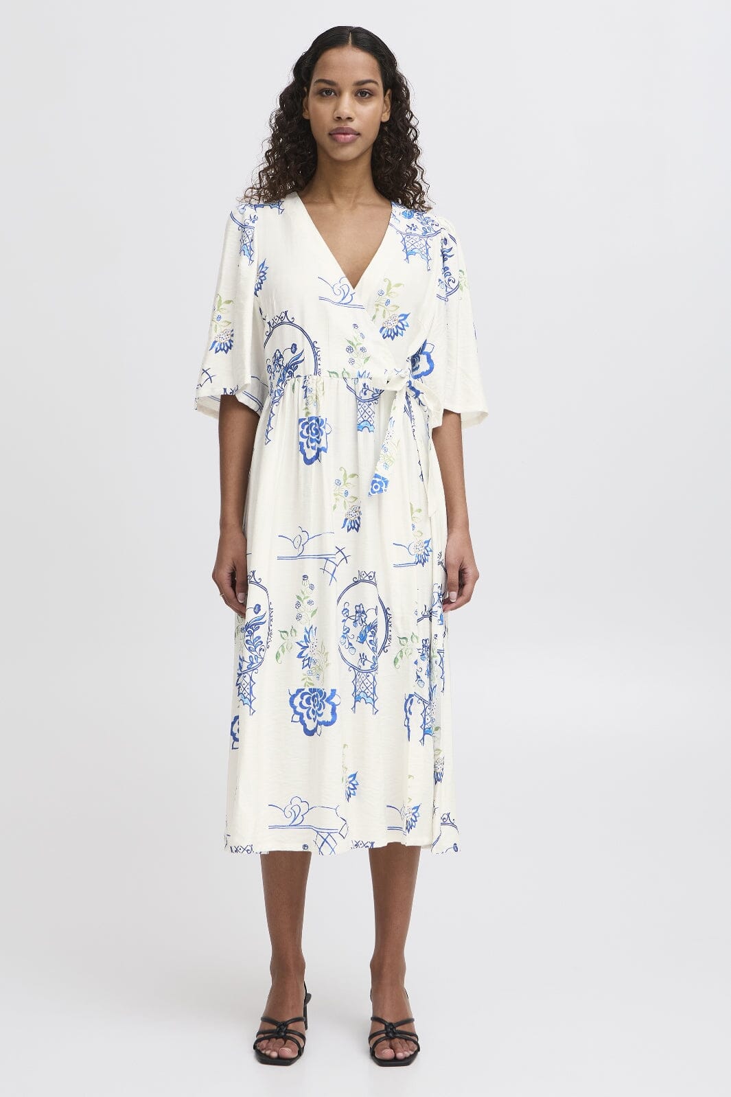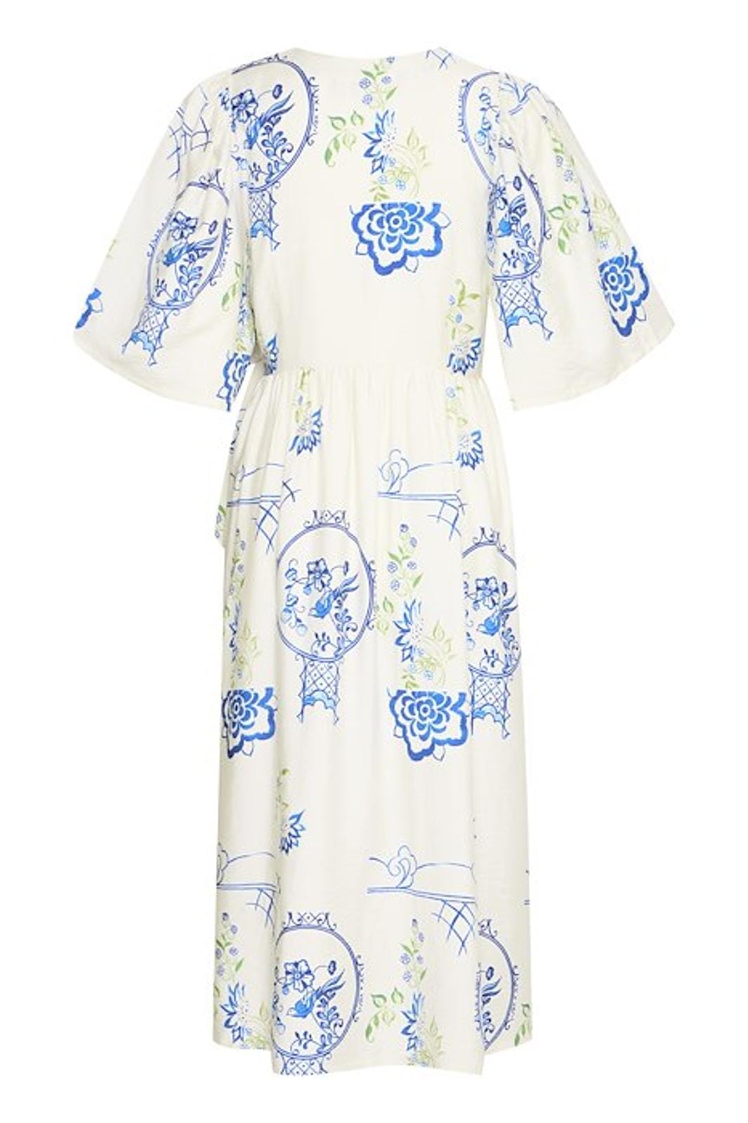 Weißes Kleid von Ichi mit blauem Blumenmuster. Es hat kurze Ärmel und einen V-Ausschnitt. Das Kleid reicht bis zur Mitte der Waden und hat einen Bindegürtel in der Taille.