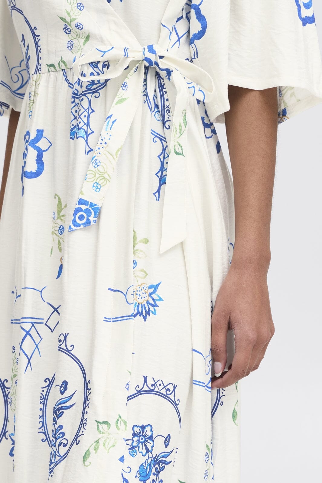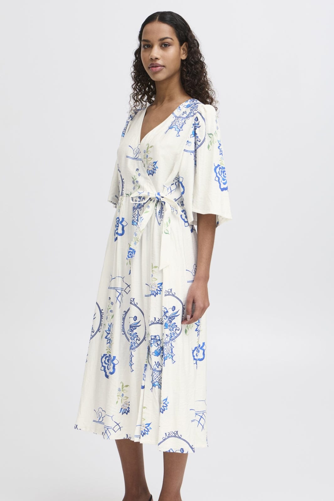 Weißes Kleid von Ichi mit blauem Blumenmuster. Es hat kurze Ärmel und einen V-Ausschnitt. Das Kleid reicht bis zur Mitte der Waden und hat einen Bindegürtel in der Taille.