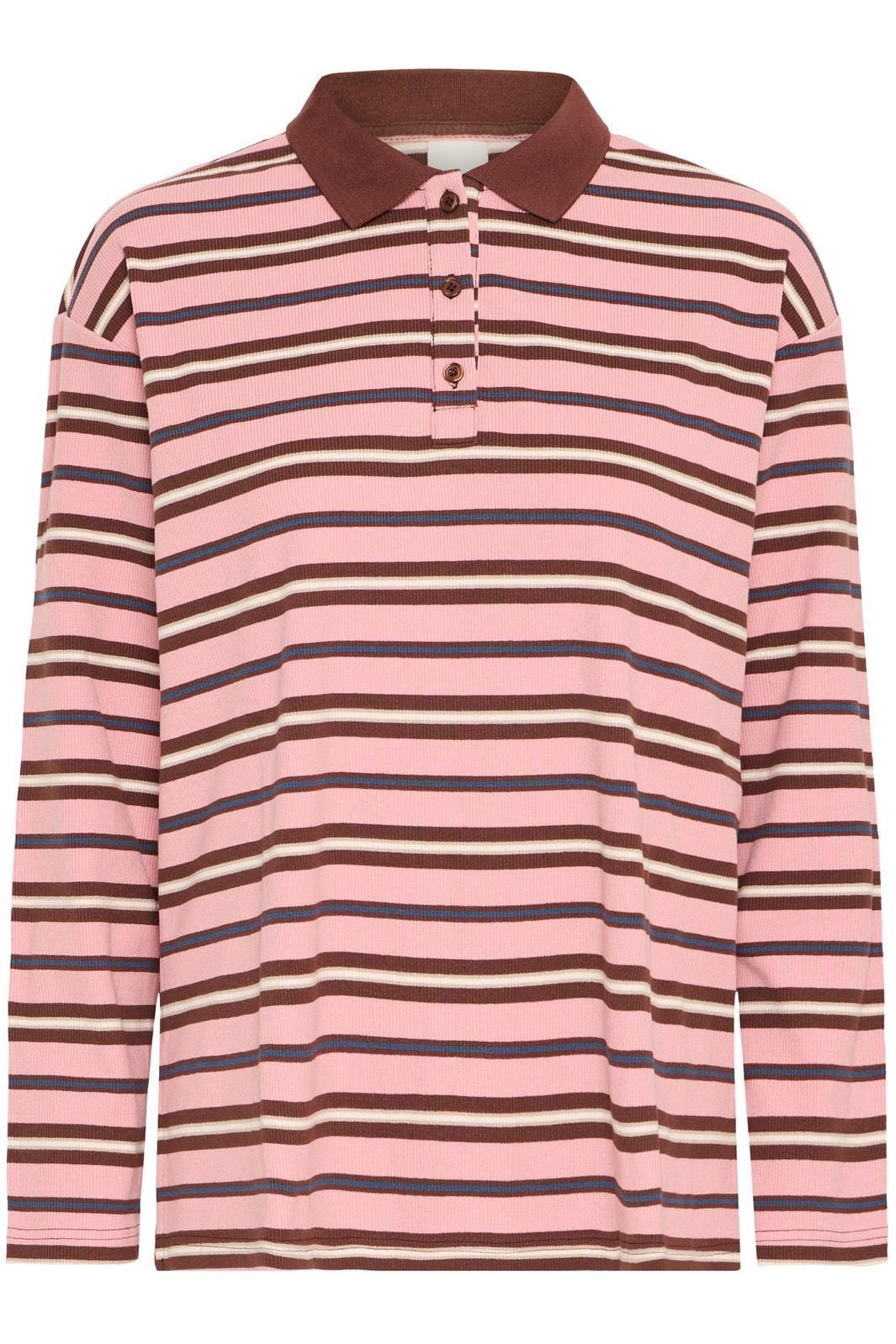 Langärmliges Polo von Ichi mit Streifen in Pink, Braun und Blau. Das Hemd hat einen klassischen Polokragen mit Knopfleiste und ein horizontal gestreiftes Muster.