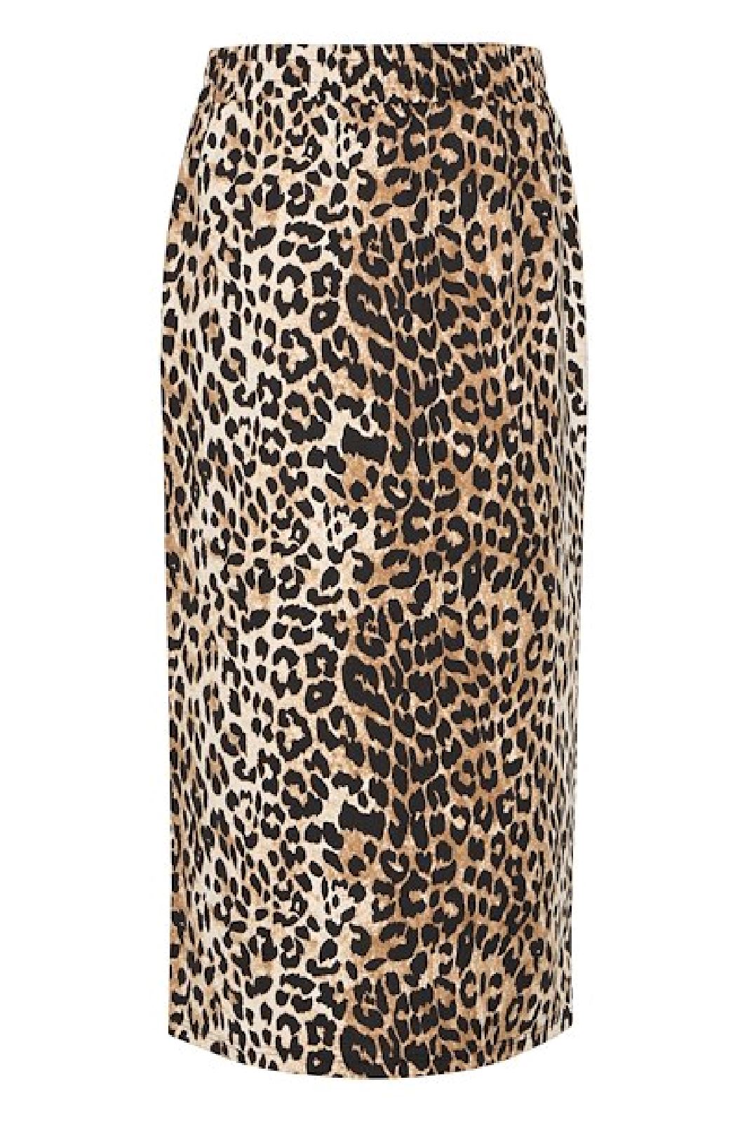 Lange Rock von Ichi mit Leopardenmuster in Braun und Beige. Der Rock hat einen Schlitz an der Seite und einen elastischen Bund, der das Anziehen erleichtert.