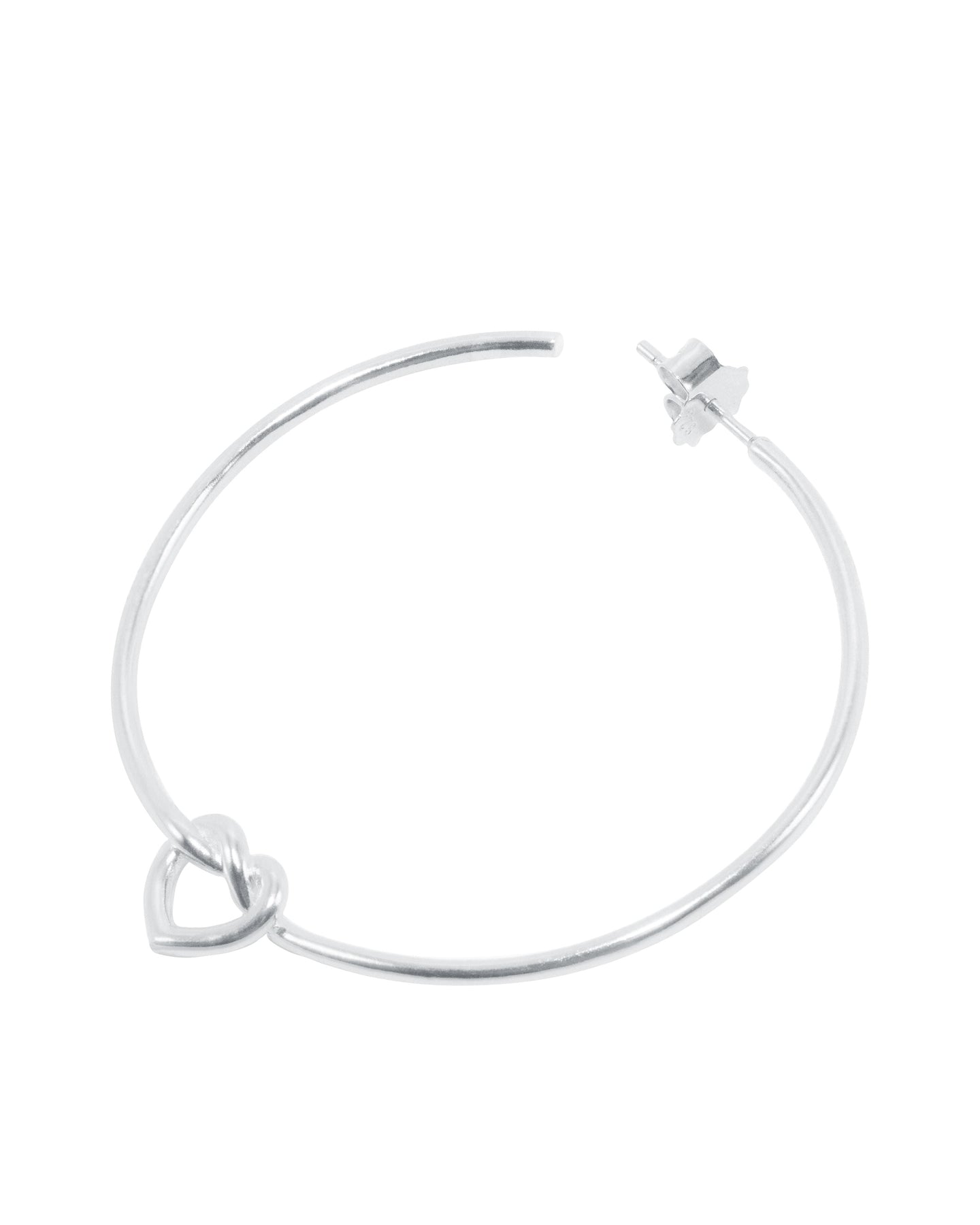Ohrring von Jane Kønig, gefertigt aus Sterlingsilber mit einem großen gebundenen Herz-Design. Das Herz sitzt an einem runden Creolenring und dient als dekoratives Element.